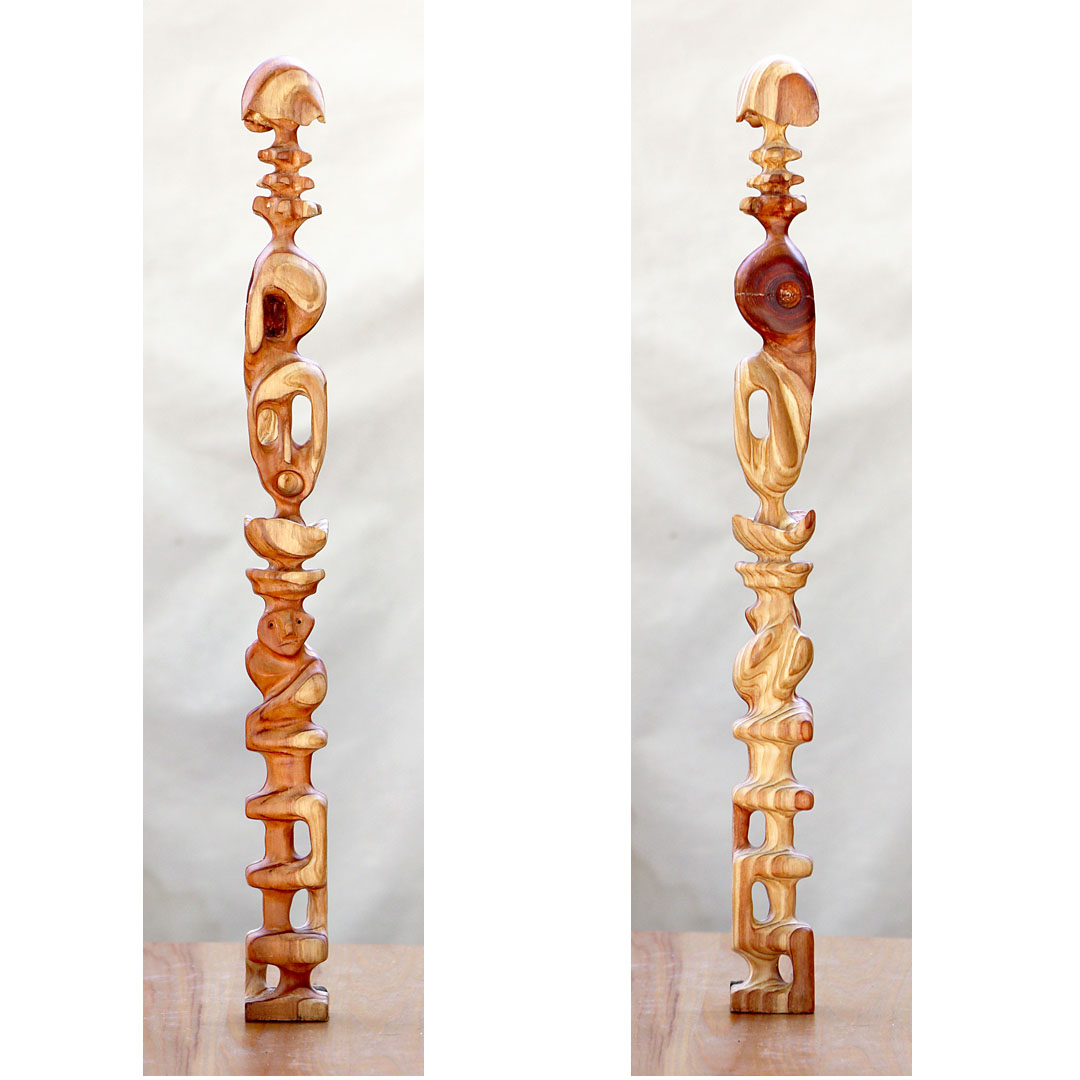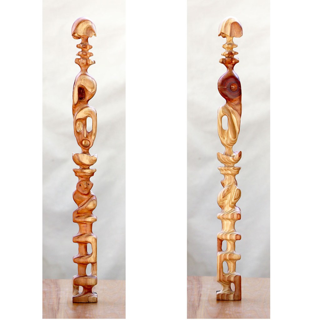 Above: Slender wood sculpture featuring intertwined figures rising vertically in continuous and delicate lines. The two abstract head-like forms at top are positioned side by side—one bare, the other with an ornamental headdress.