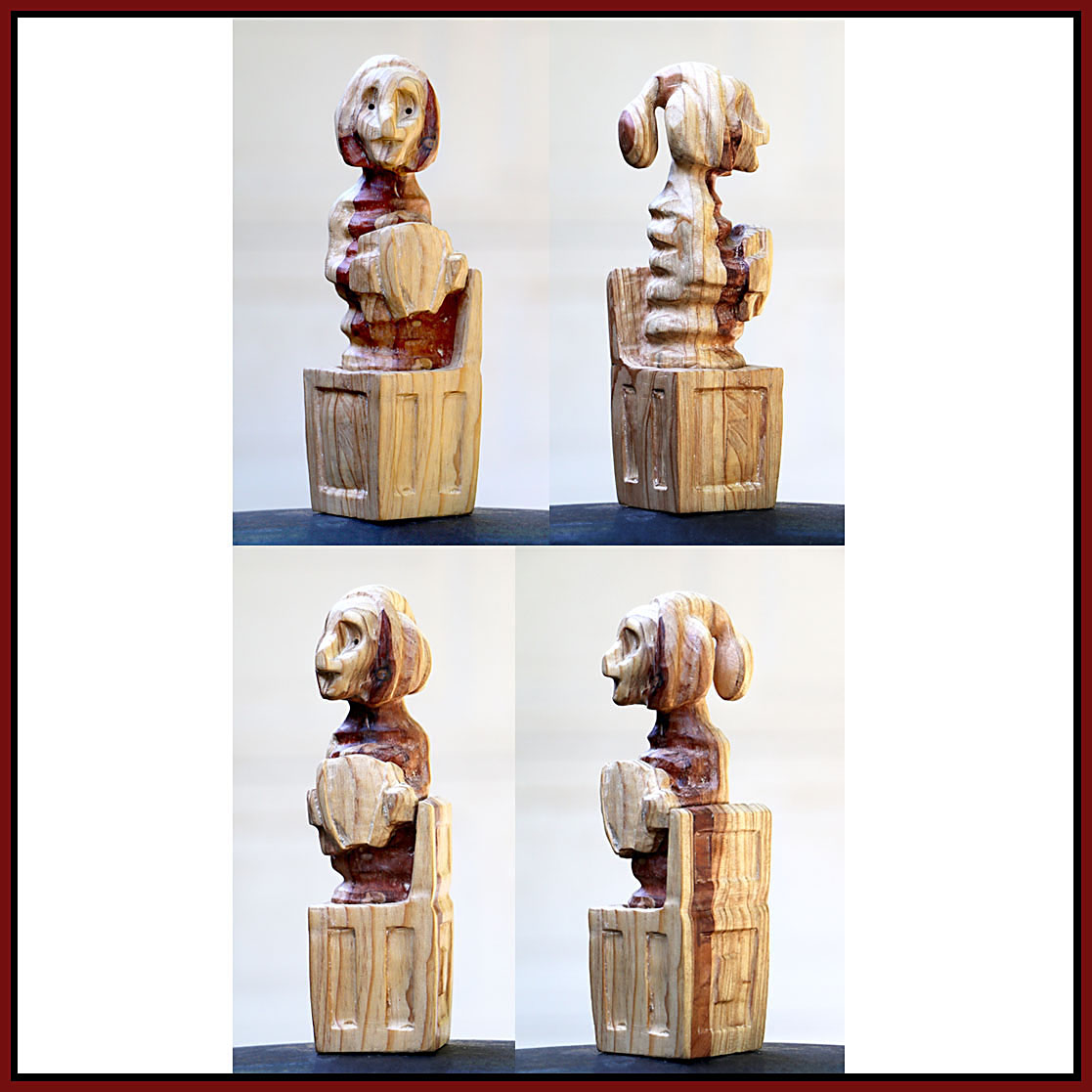 Above: This square wood block has been carved into a 360 degree rotating cast of simple stylistic faces that your mind must extract. As the block rotates new expressions come into view…playful, eager, surprised, bewildered, dumb?