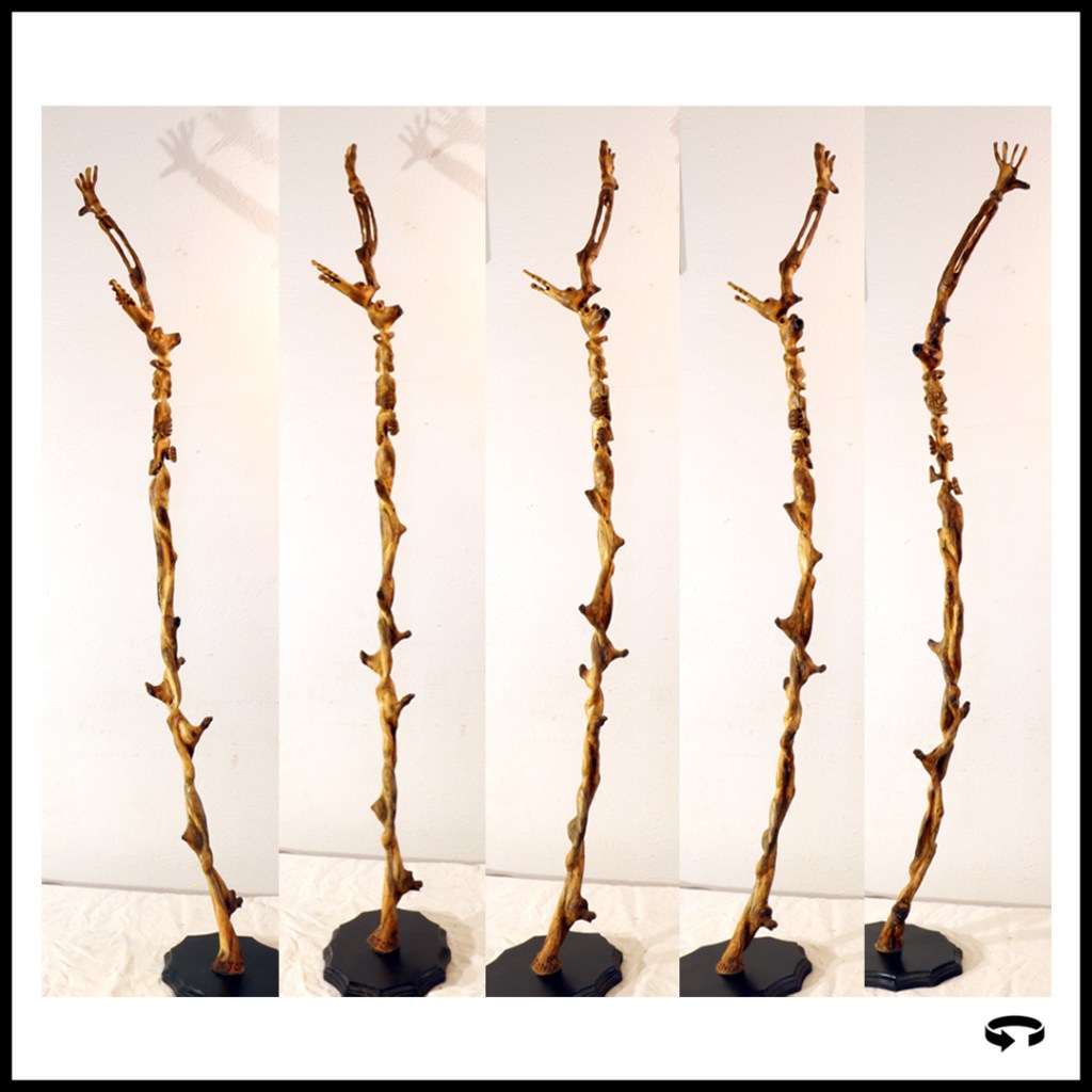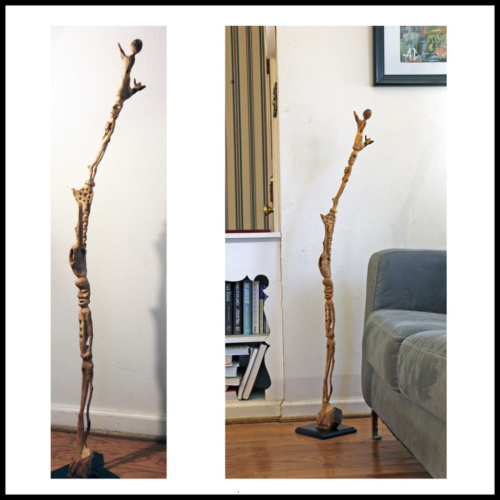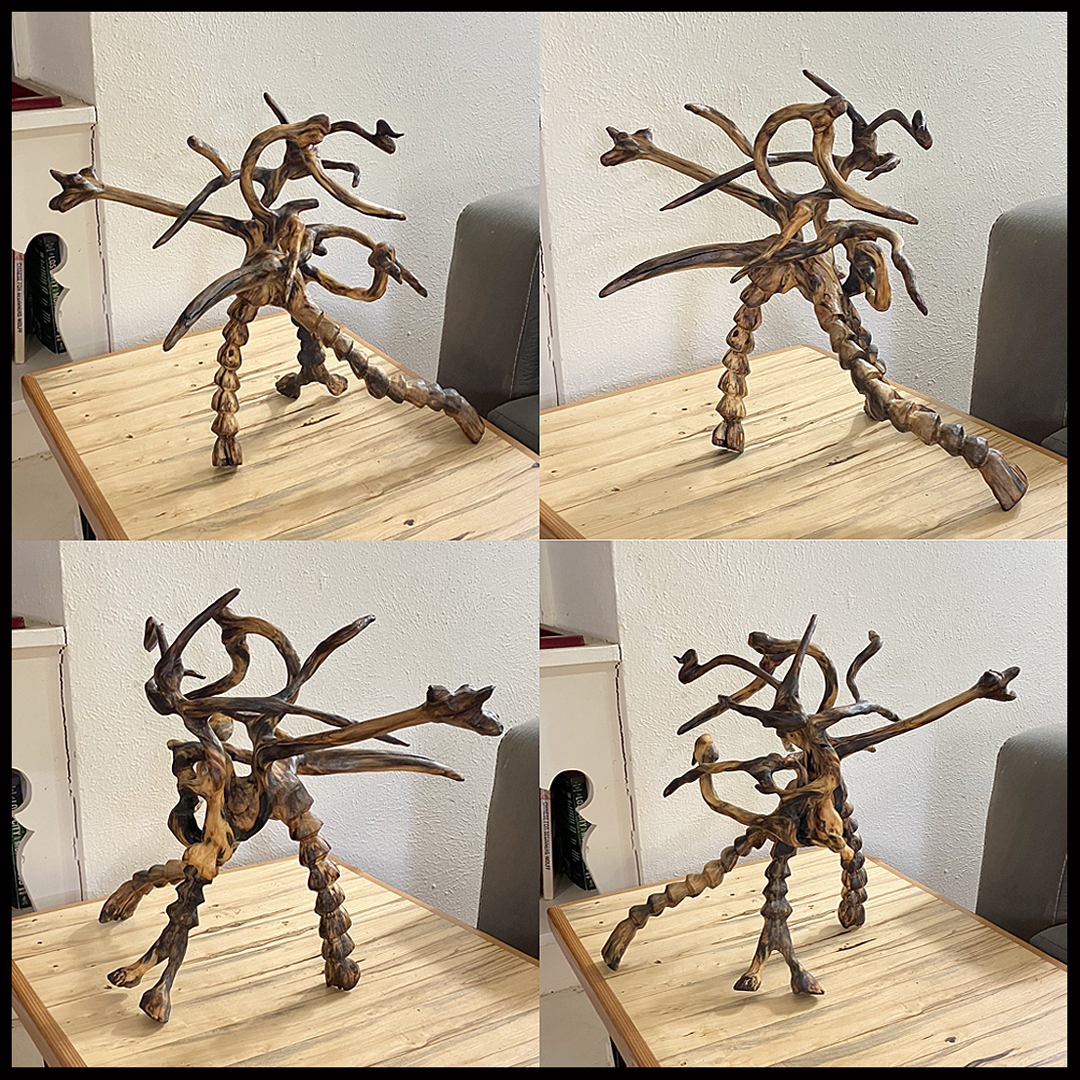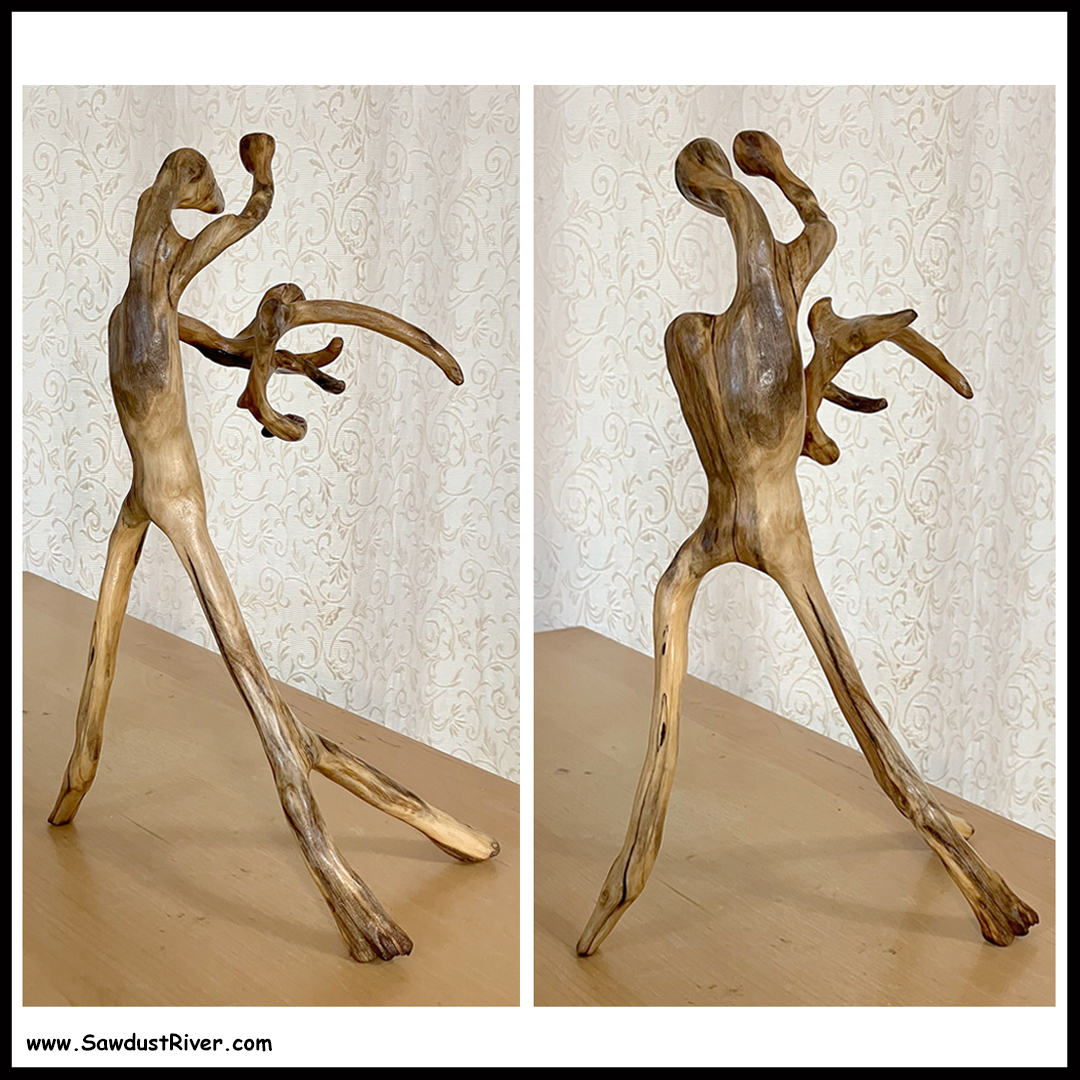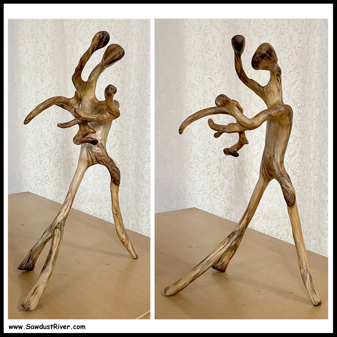 Above: Hand carved wood sculpture with gnarled legs and wild arms, caught mid-stride. The carving blends arboreal structure with biomorphic limbs, poised for movement.