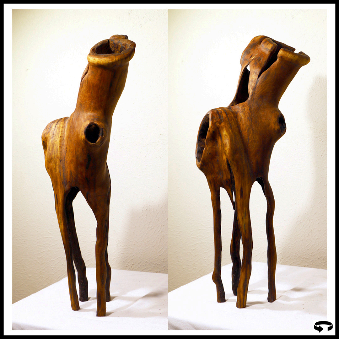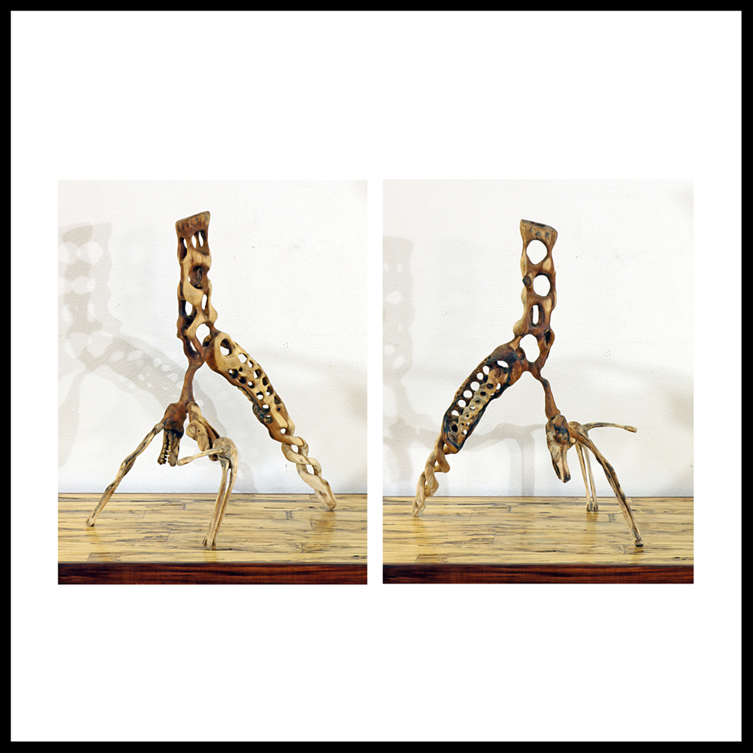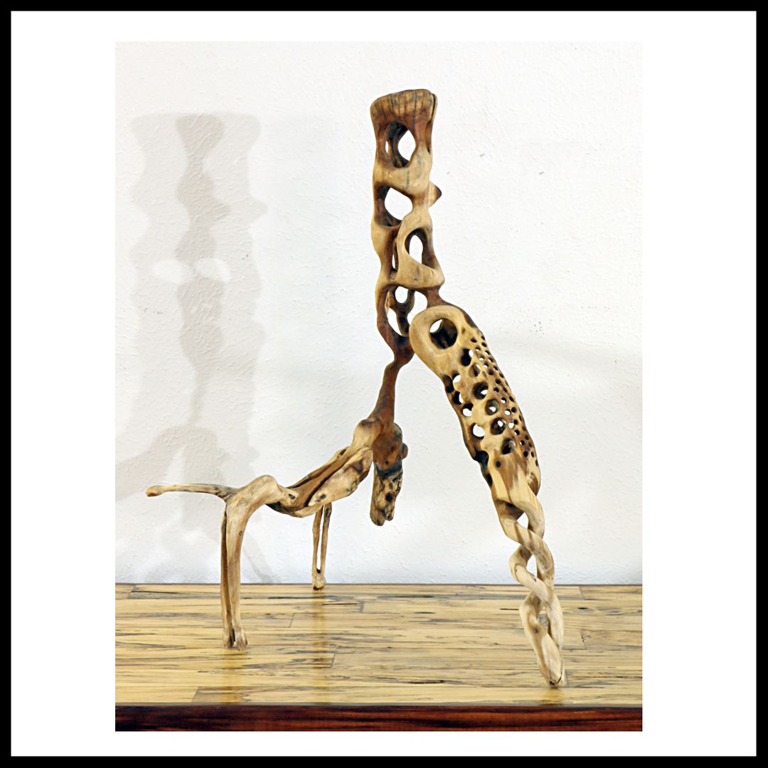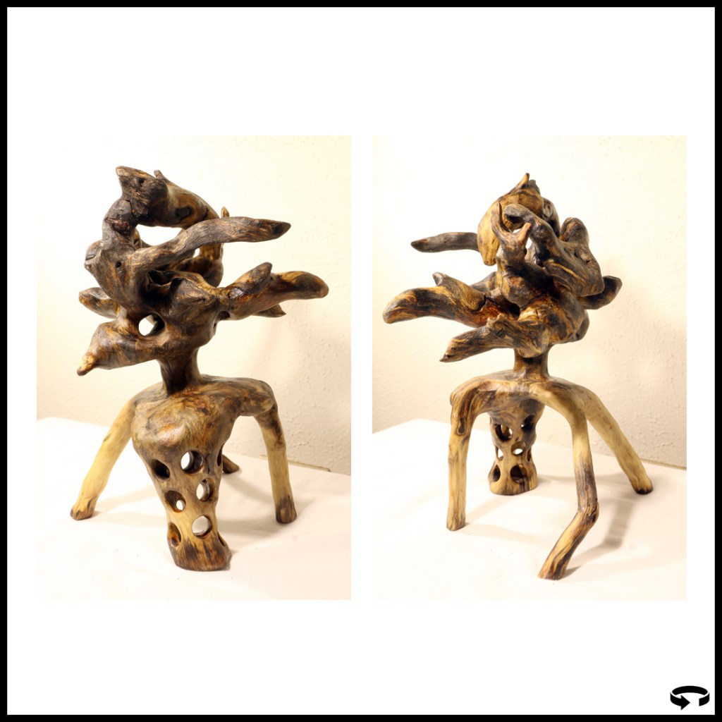 Above: Hand carved wood sculpture with gnarled legs and wild arms, caught mid-stride. The carving blends arboreal structure with biomorphic limbs, poised for movement.