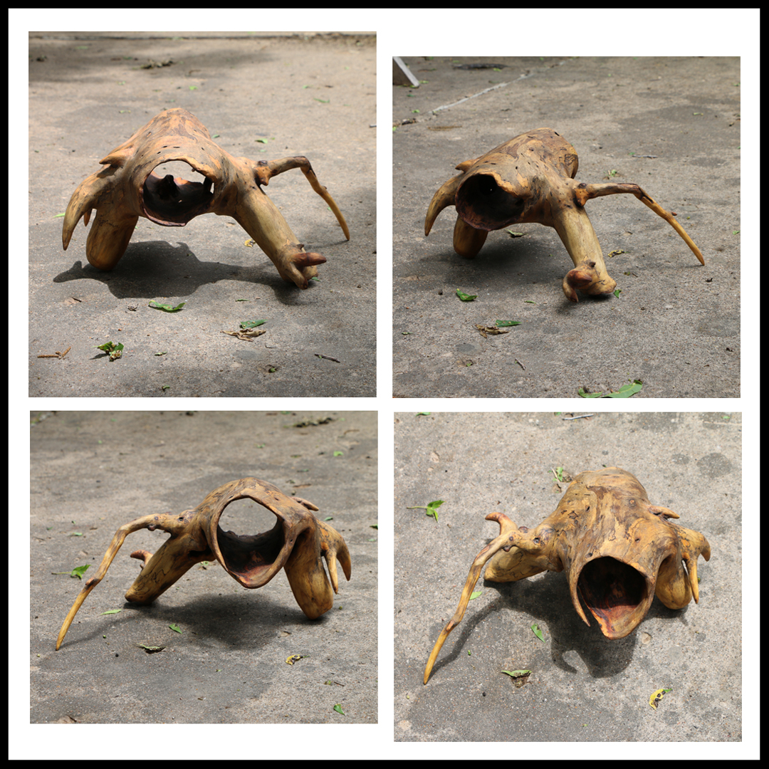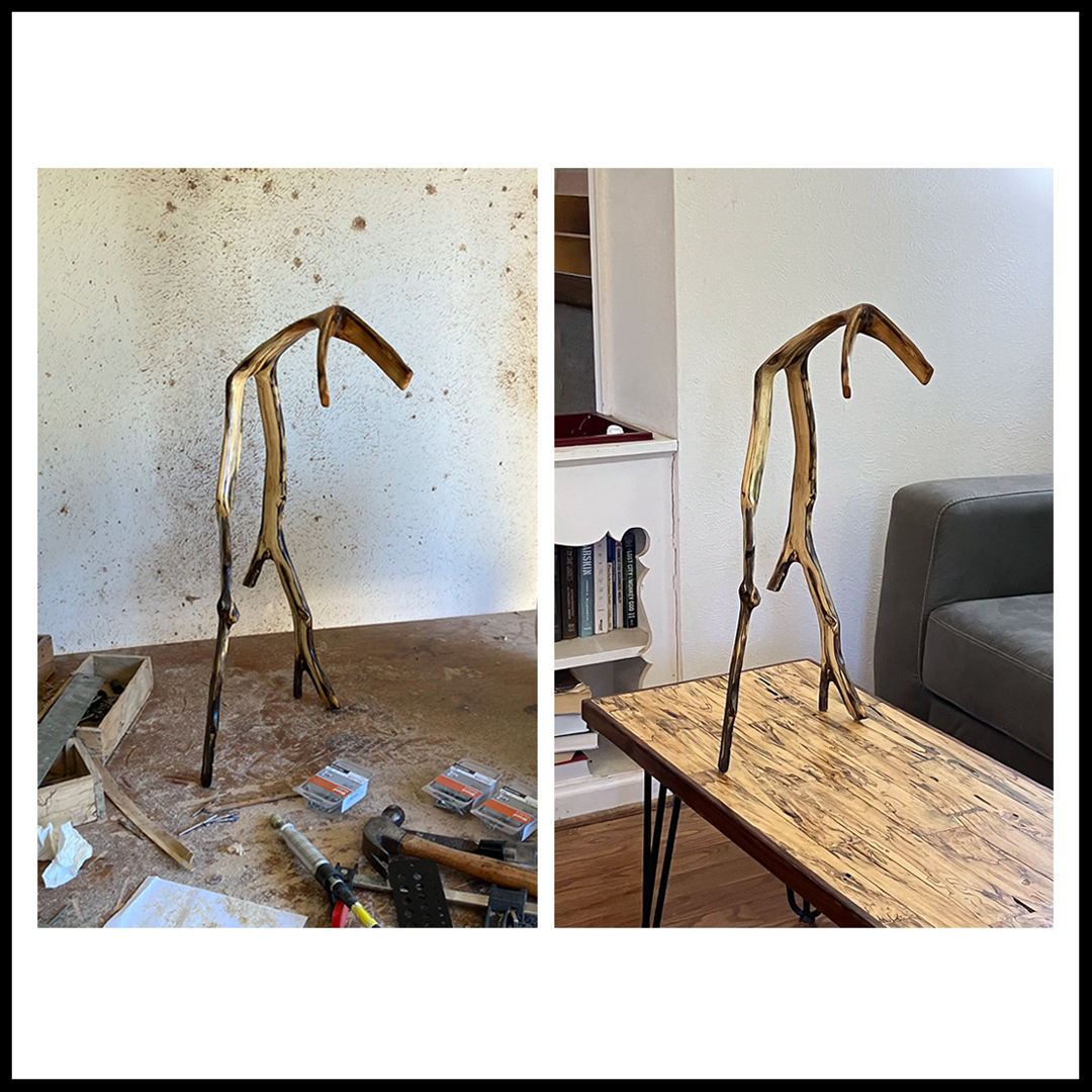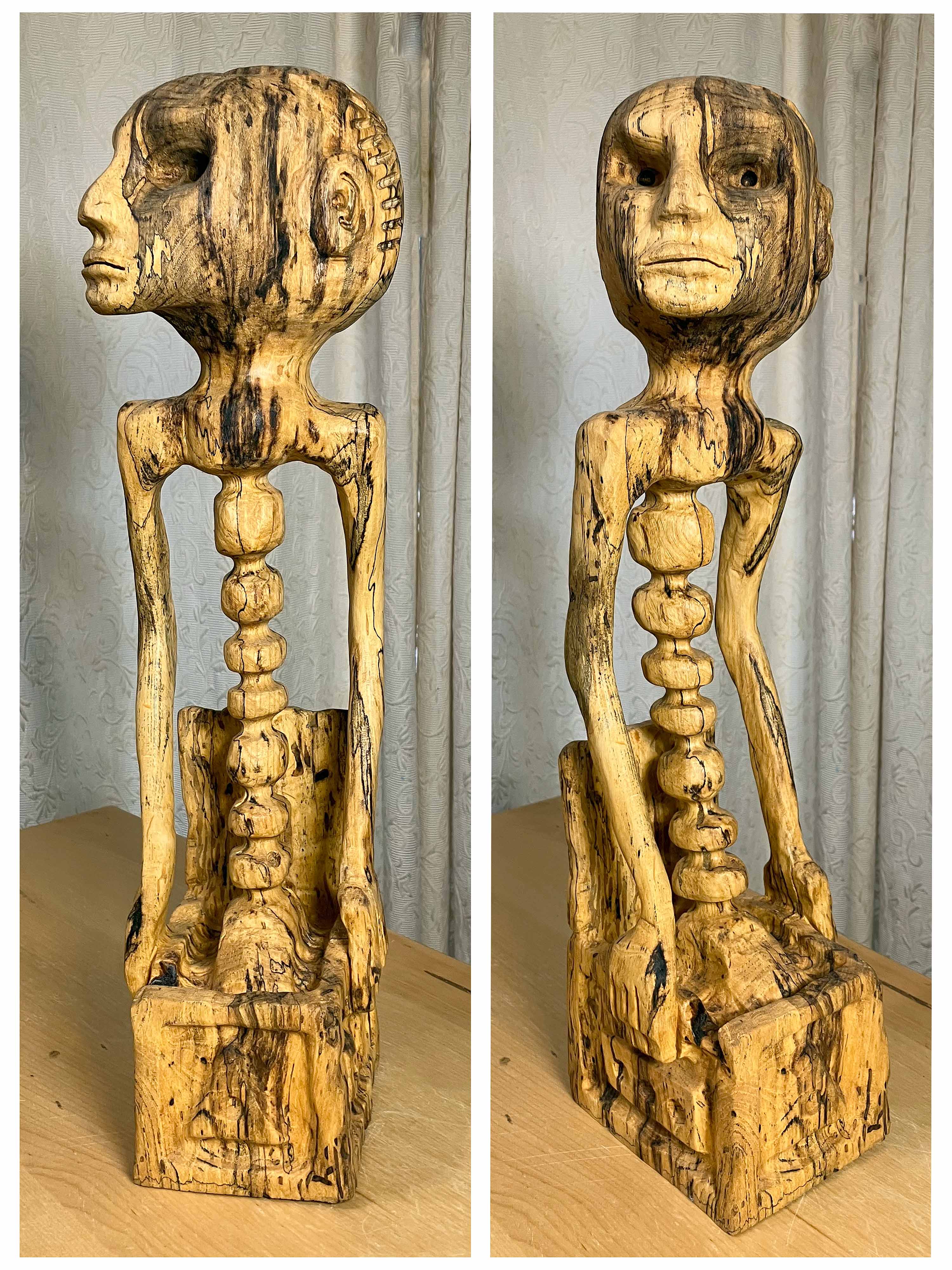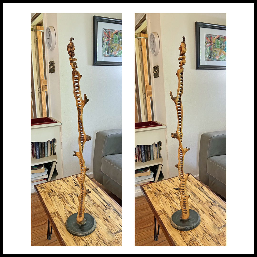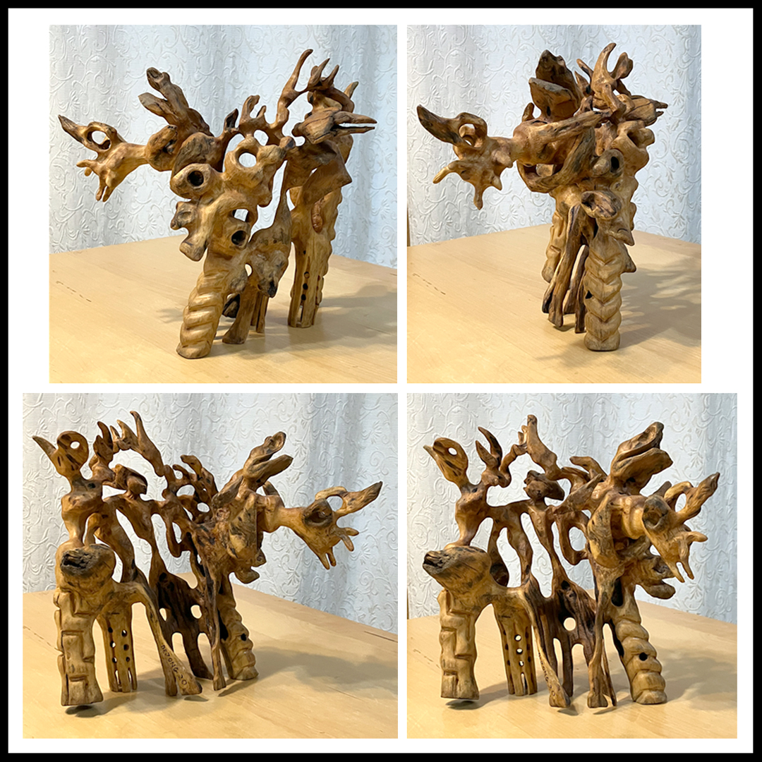 Above: Hand carved wood sculpture with gnarled legs and wild arms, caught mid-stride. The carving blends arboreal structure with biomorphic limbs, poised for movement.