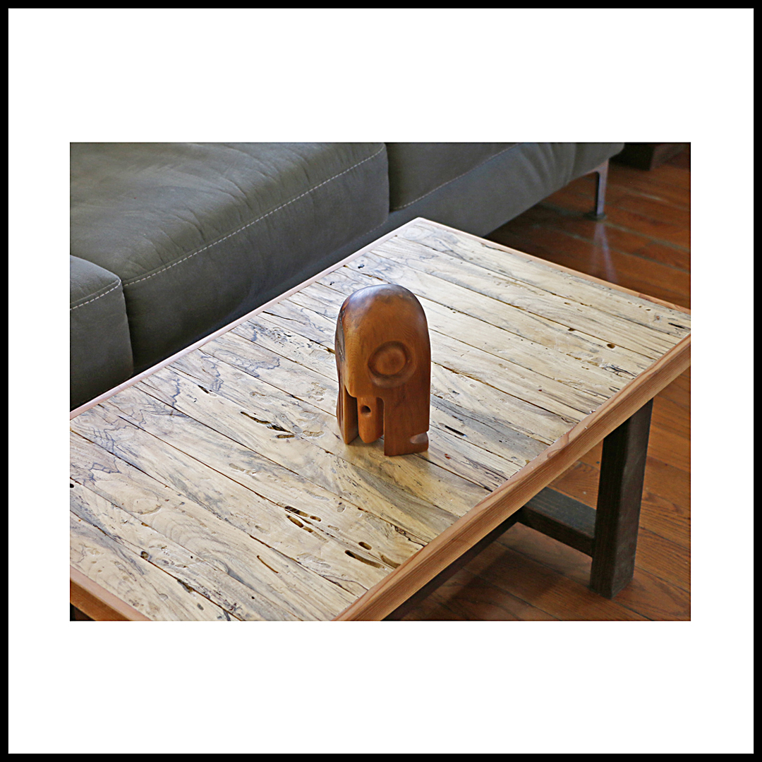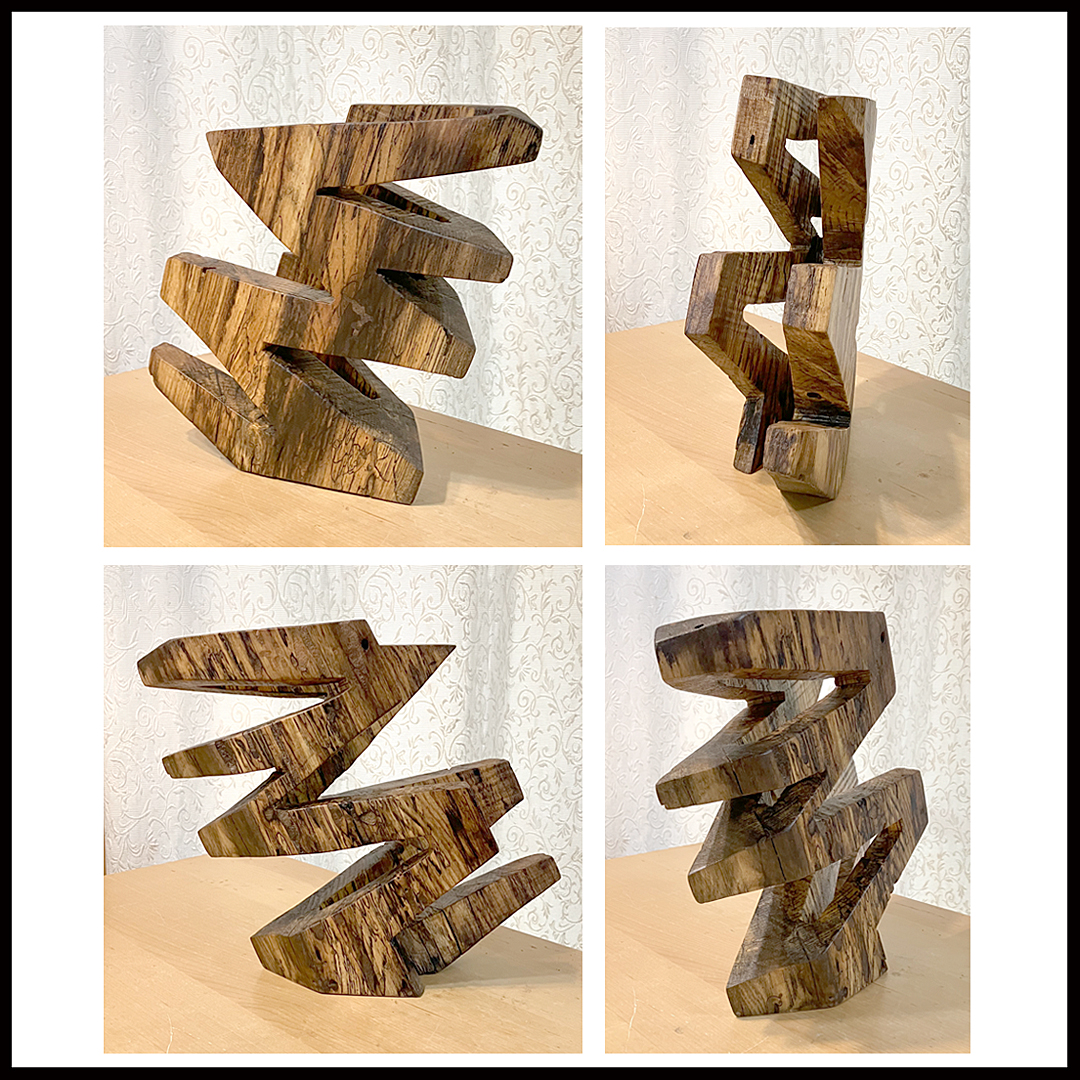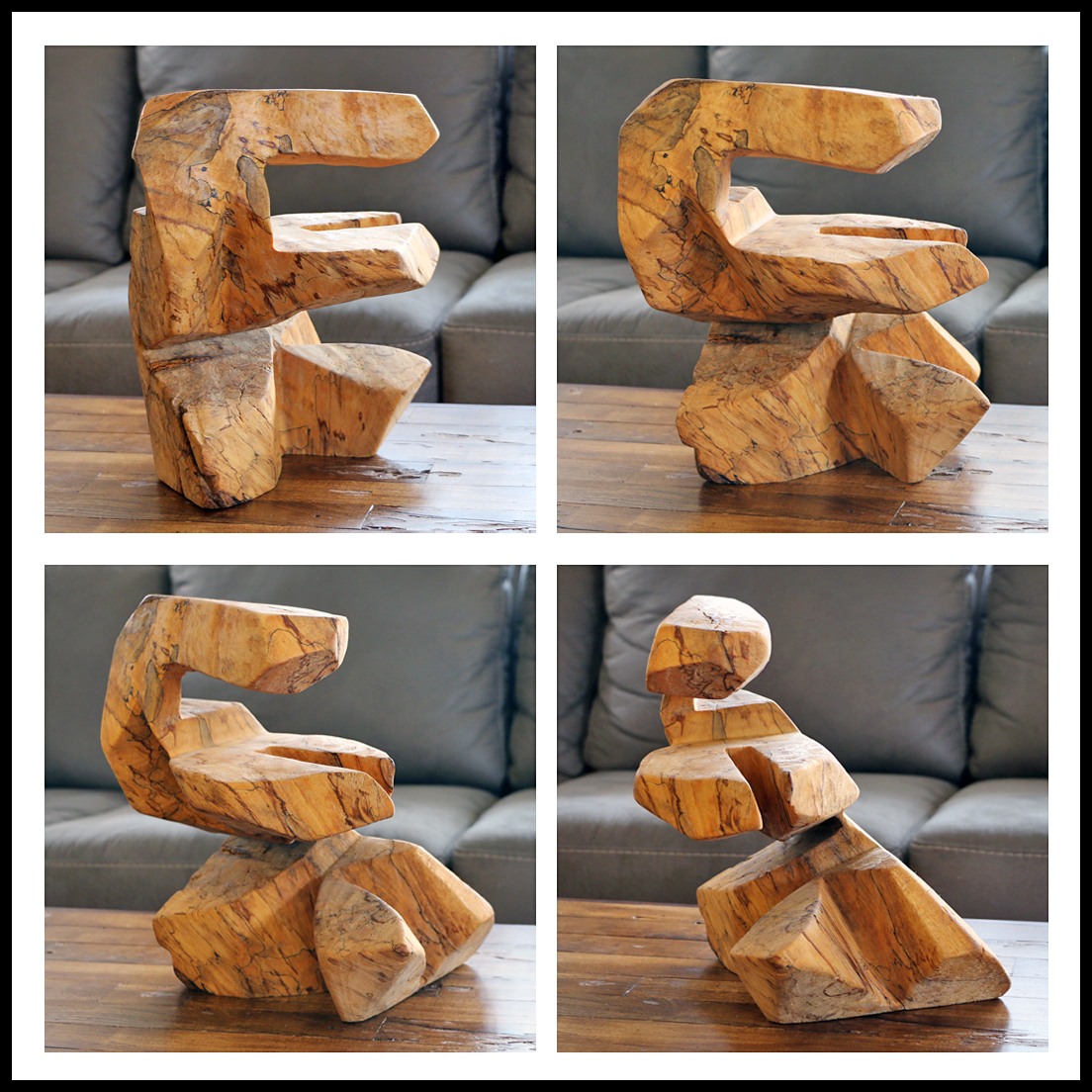Above: Angular and tilted block-form sculpture with spalted surface, this abstract form sits askance with geometric legs, arms, and head.