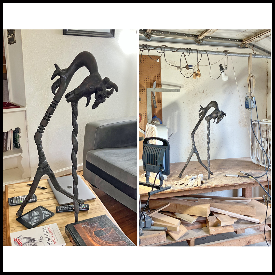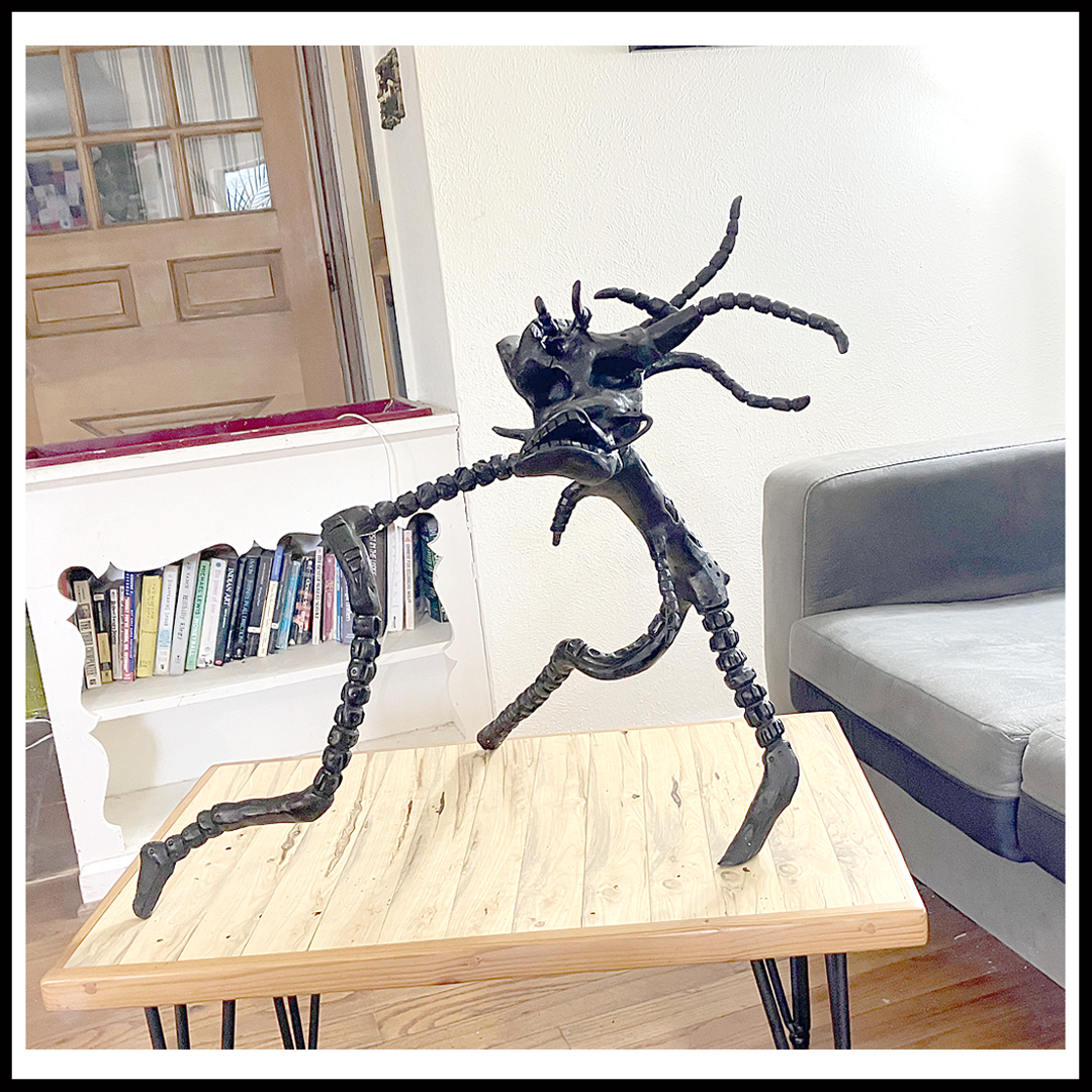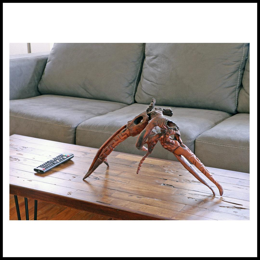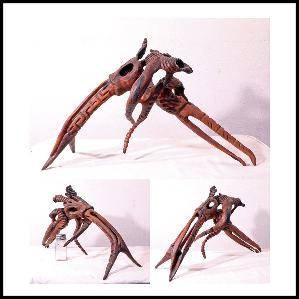 Above: Unusual wood sculpture of some prehistoric or alien organism in a poised, searching stance. Its long, raised, claw-like arm—combined with the otherworldly, skeletal aspect of the figure—suggests lethality, predation.
