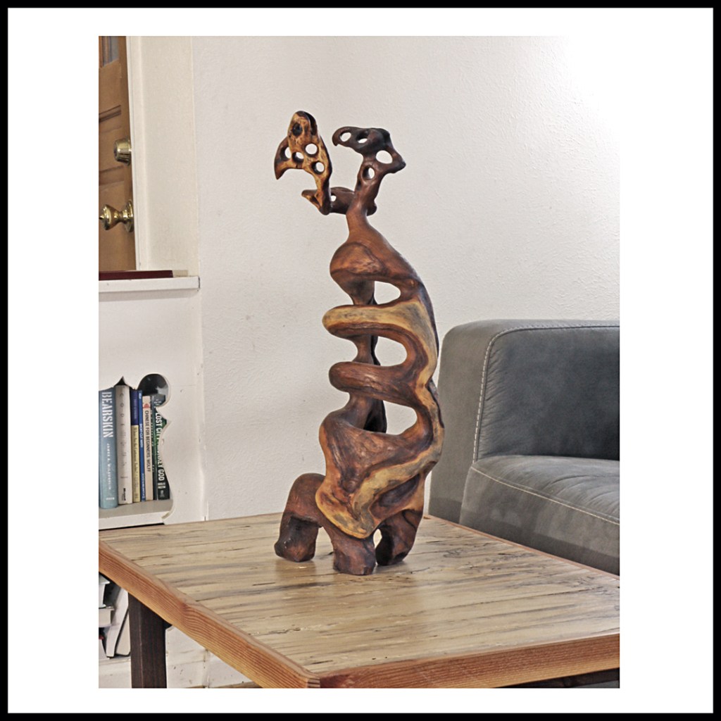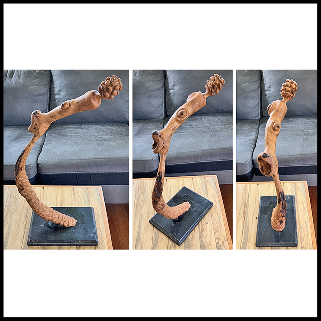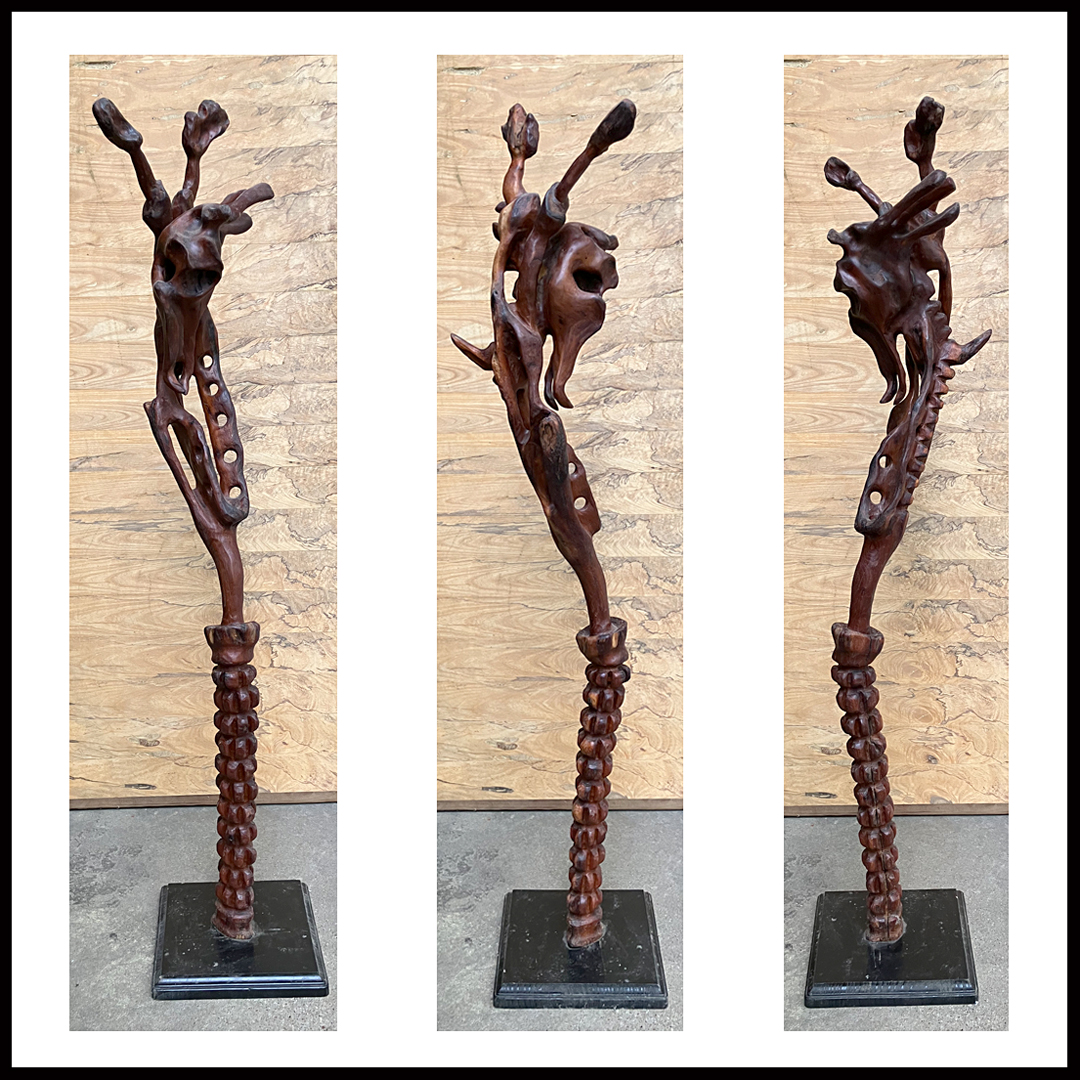 Above: Ebony stained wood carving with three point globular legs supporting a convoluted root swirl, one tendril reaching upward, exploring.