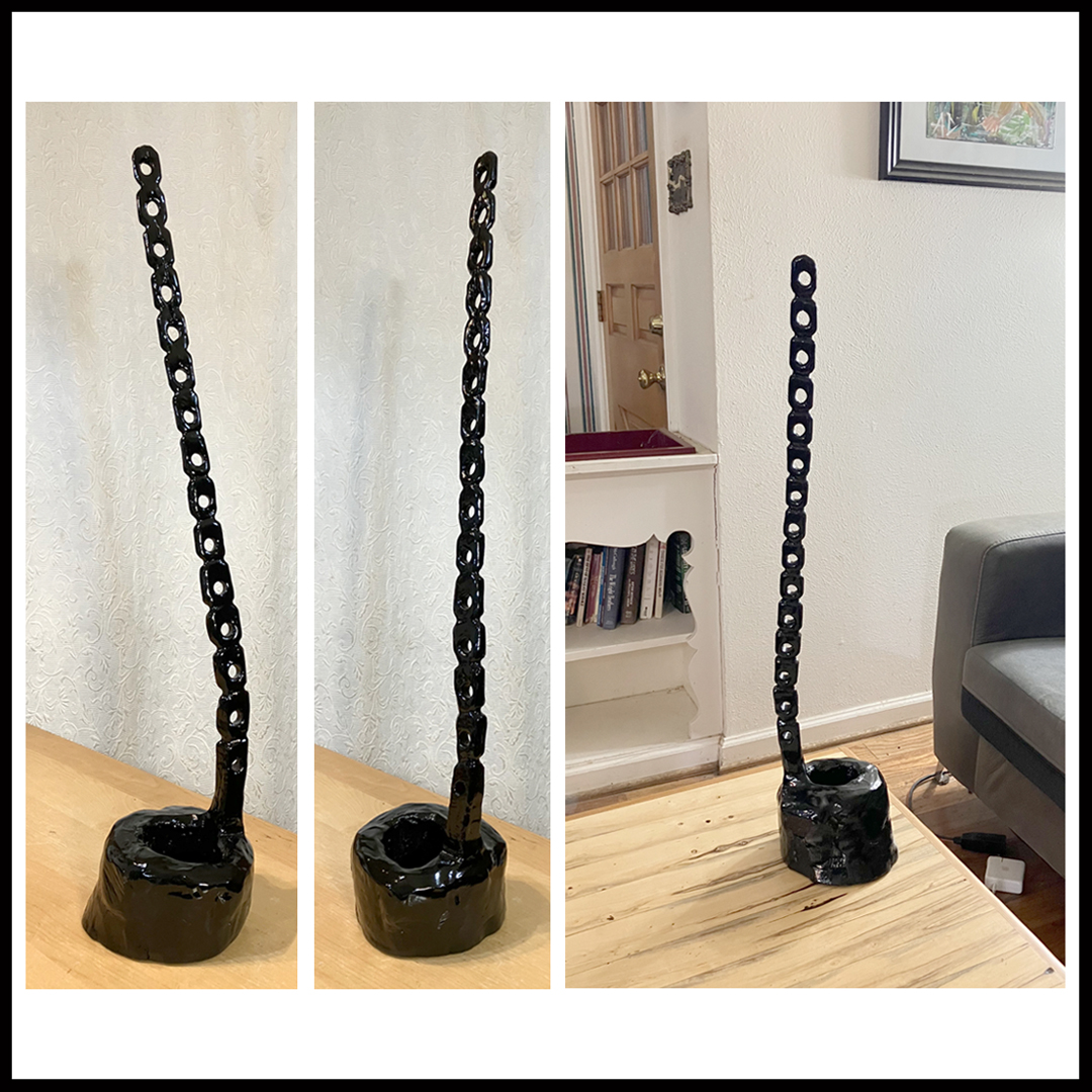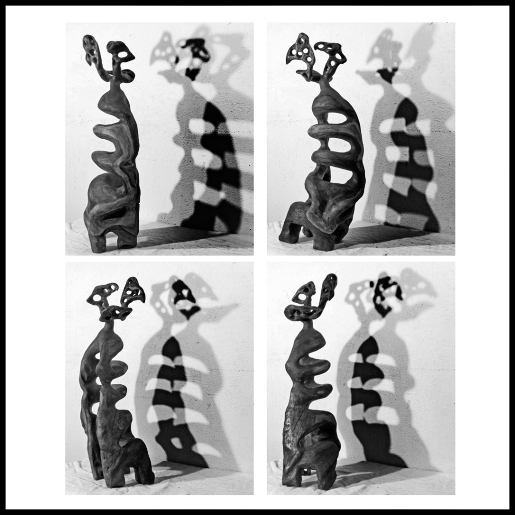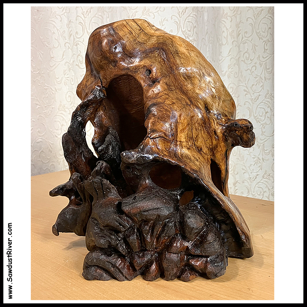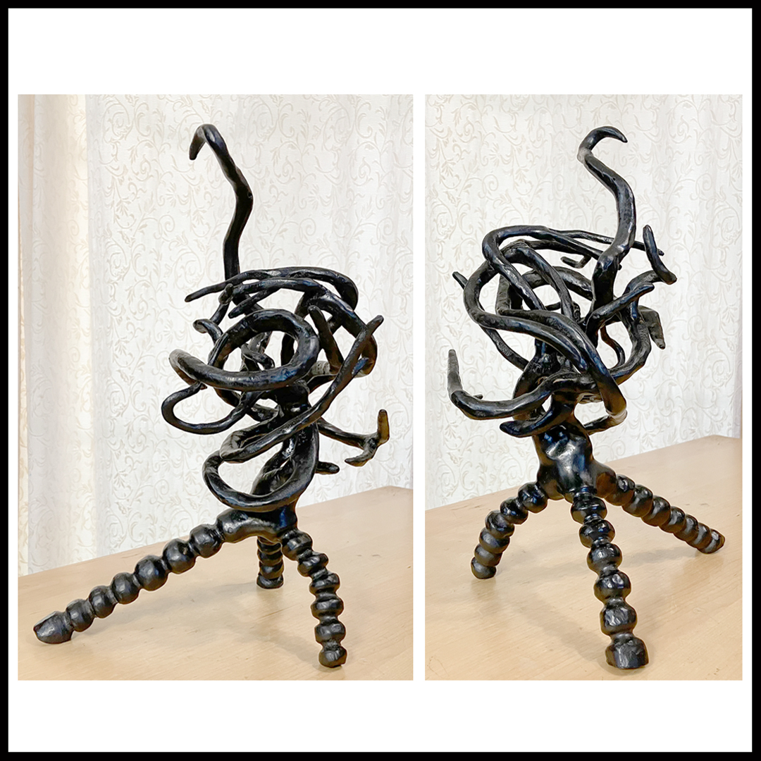 Above: Ebony stained wood carving with three point globular legs supporting a convoluted root swirl, one tendril reaching upward, exploring.
