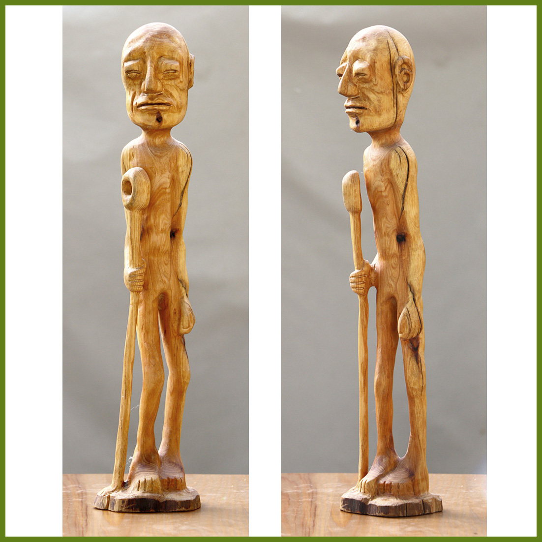 Above: Wood carved sculpture of a male figure, standing with staff, a traveler, a final pilgrimage.