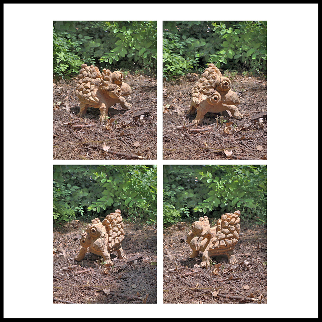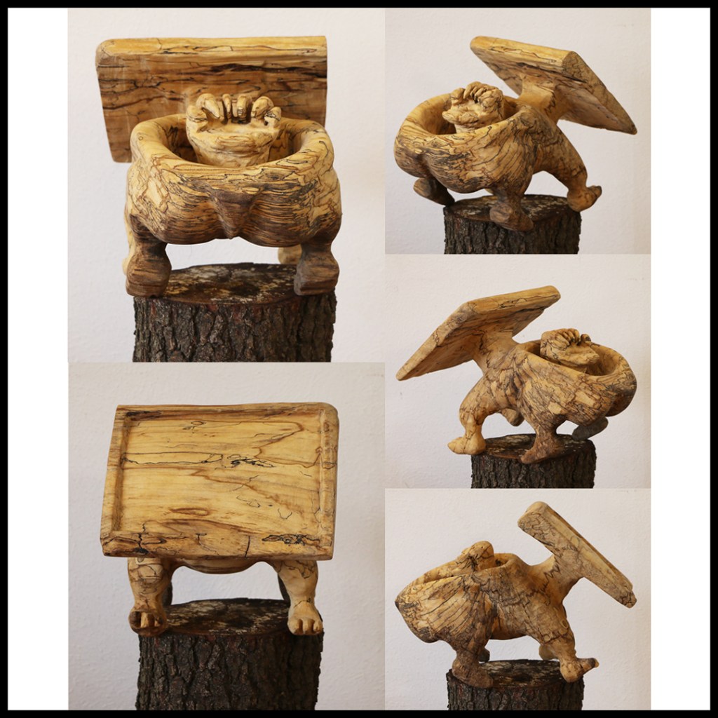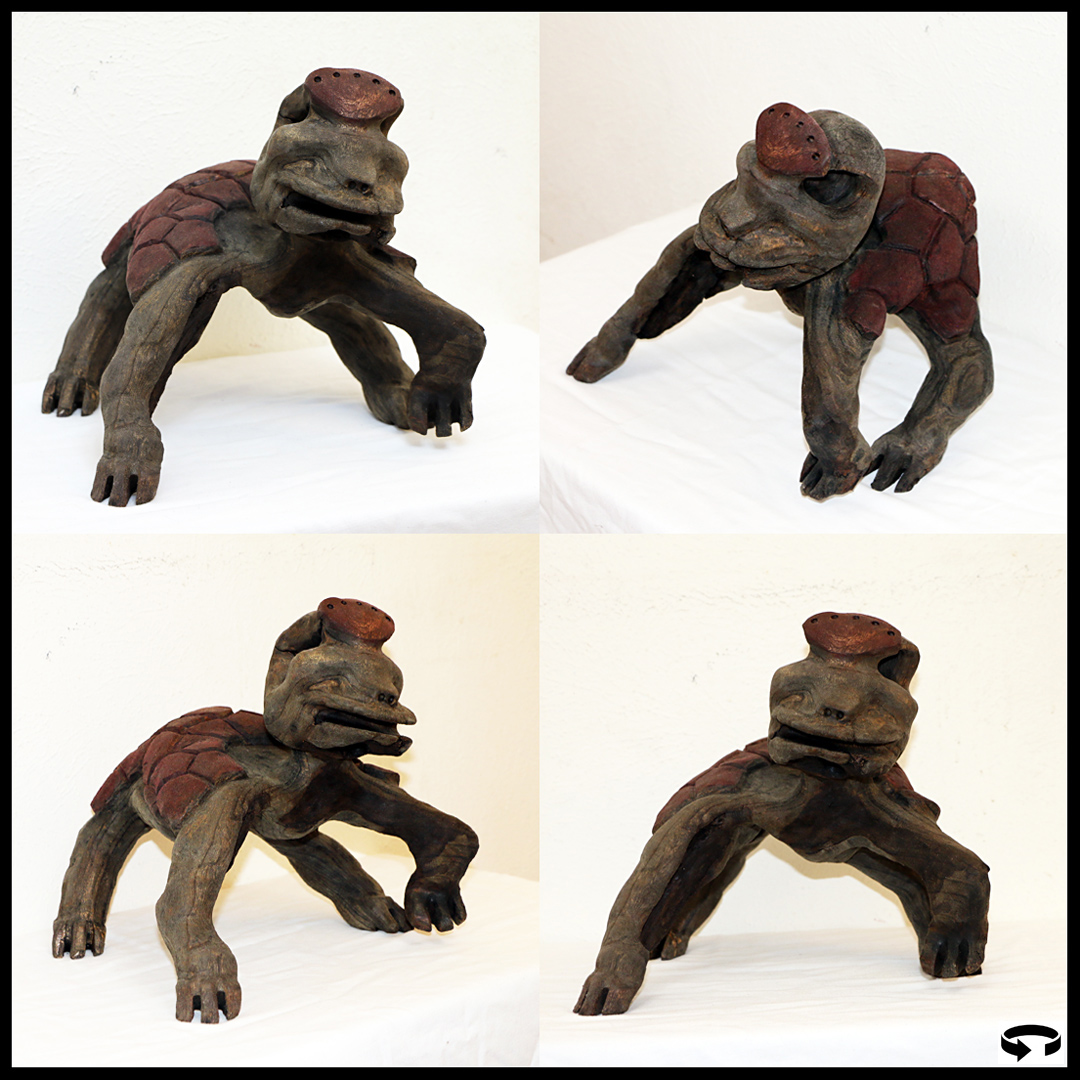 Above: This wooden sculpture depicts a turtle-like creature with a heavy build, deep-set eyes, and a poised posture. The creature can move very slowly, but the movement is imperceptible.