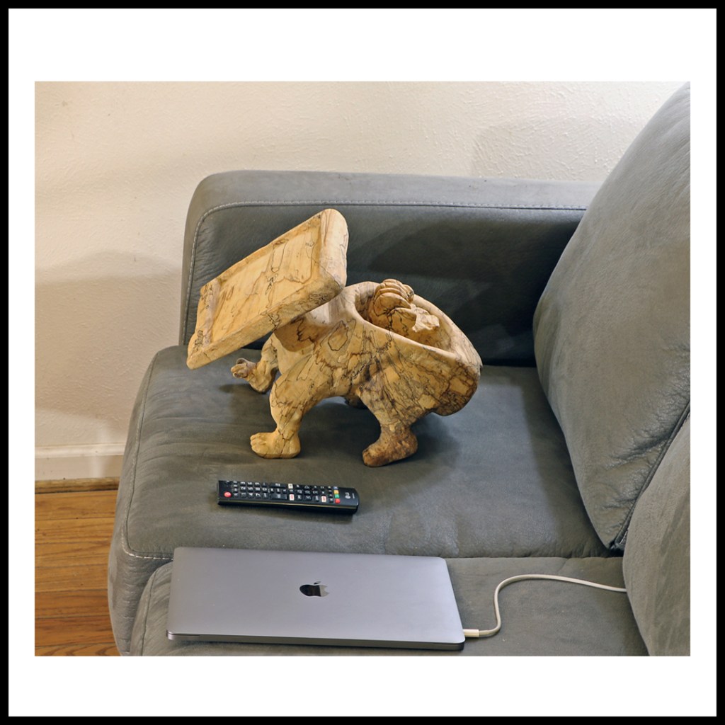 Above: Hand-carved biomorphic bird-god reclines in creature-like posture, gazing outward with spindly appendages that twist and fork chaotically.