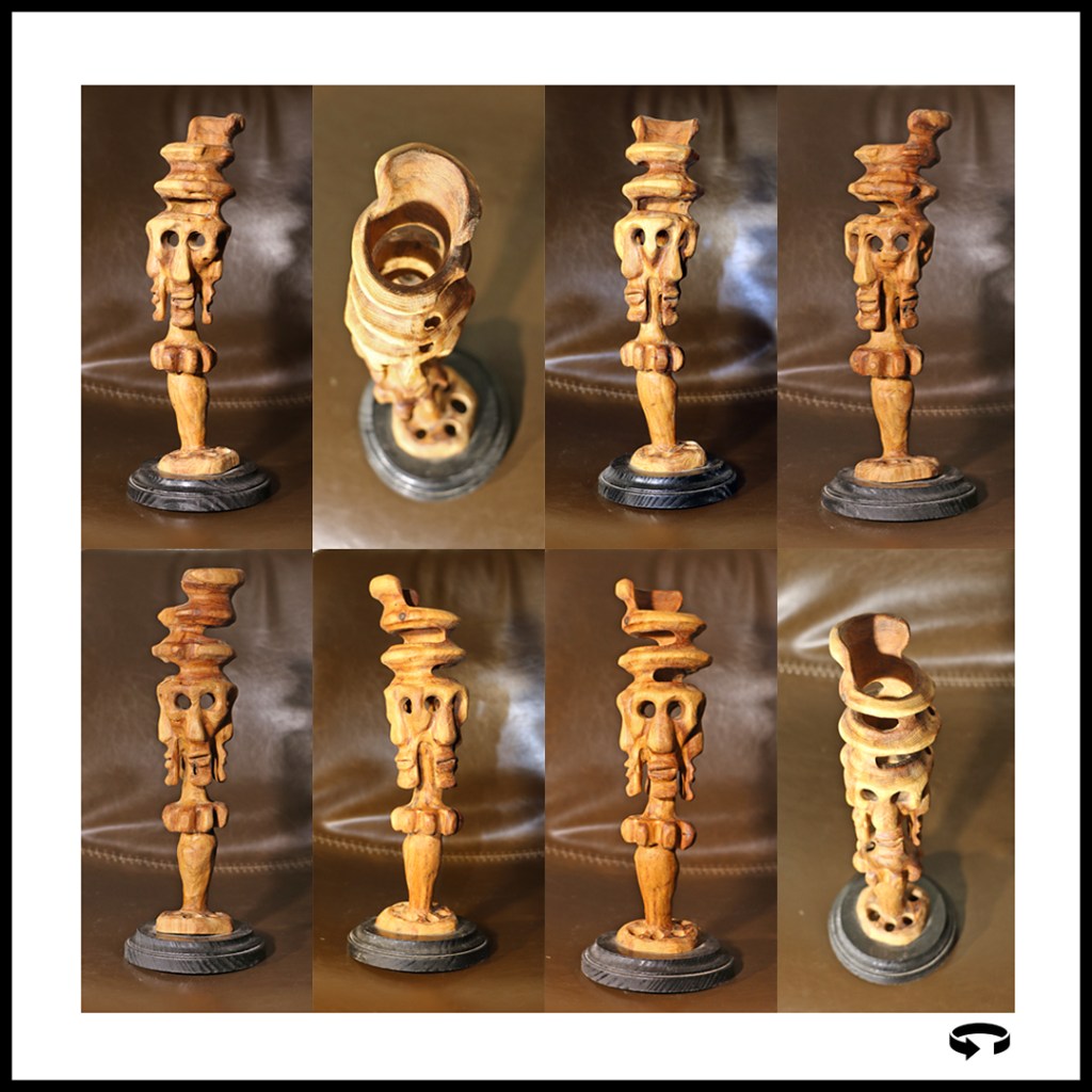 Above: This small wood sculpture is carved with a rotary-style crowned head that appears face-like from all angles. The slight bow or downward tilt suggests weight or contemplation.