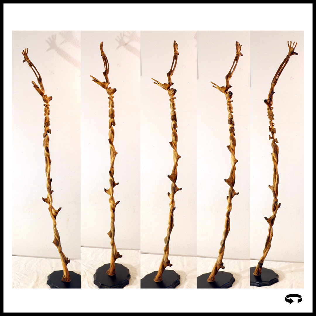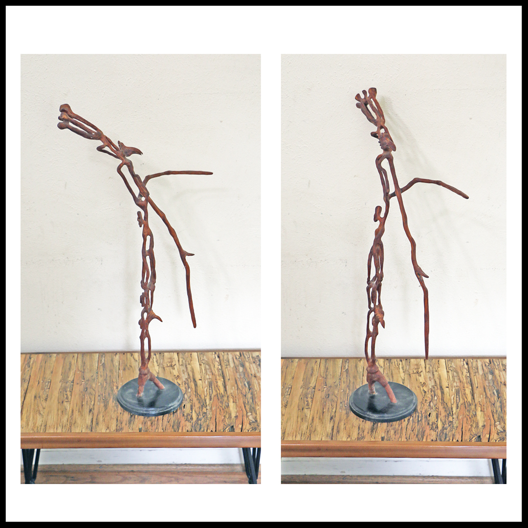 Above: Spindly wood sculpture composed of thin, bony, and irregular lines that twist and branch upward. Towards the top a gangly figure somehow emerges, at an awkward angle, suspended, its limbs projecting outwards as though mid-step.