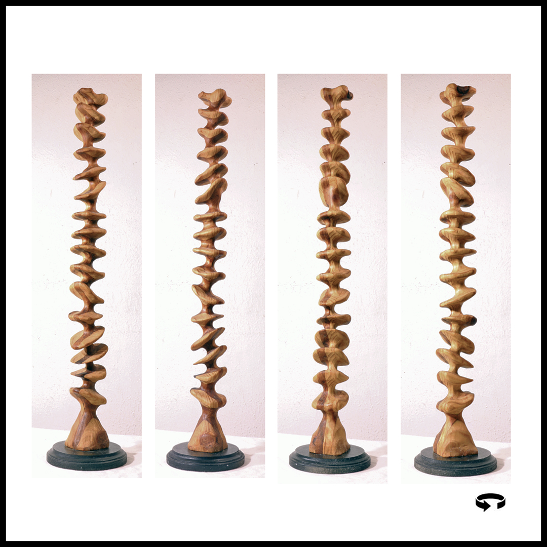 Above: Carved from wood, this sculpture consists of a rhythmic sequence of ring-like forms rising in a straight column. Each ring shifts its angle to create a dynamic and irregular sense of movement and variation.