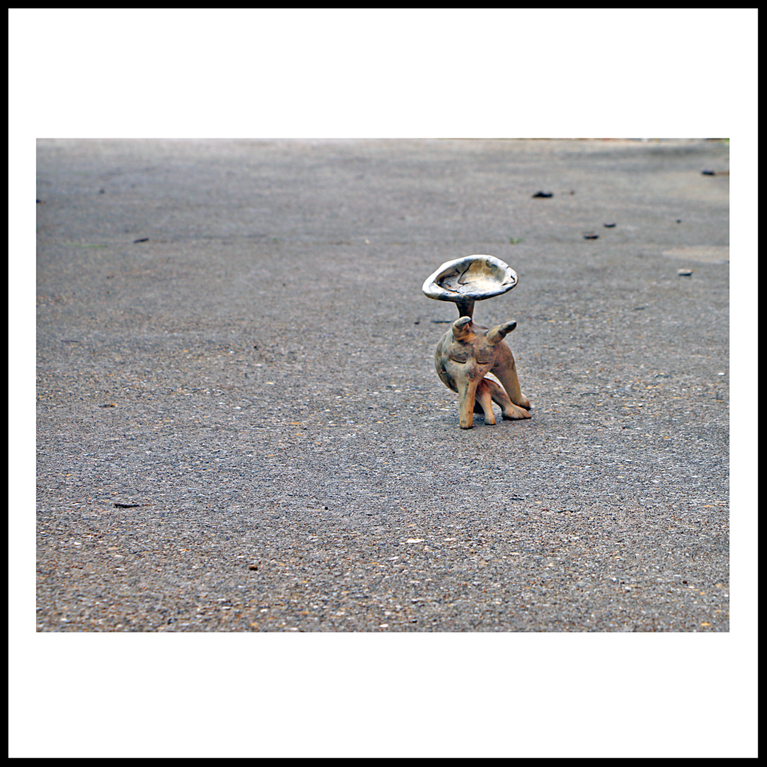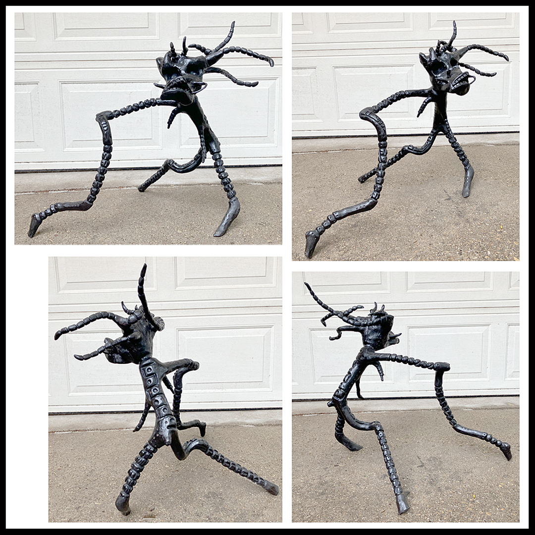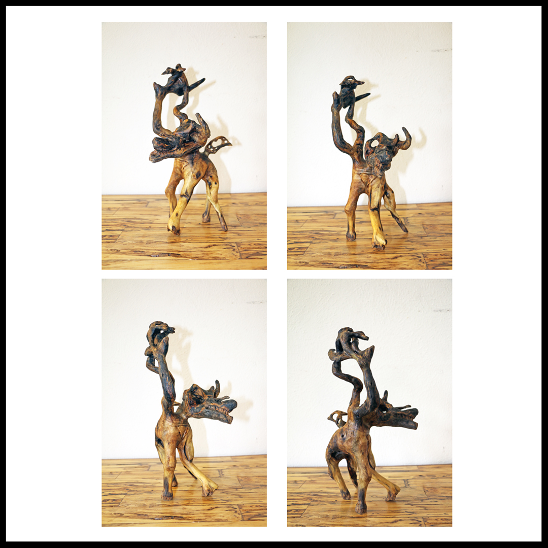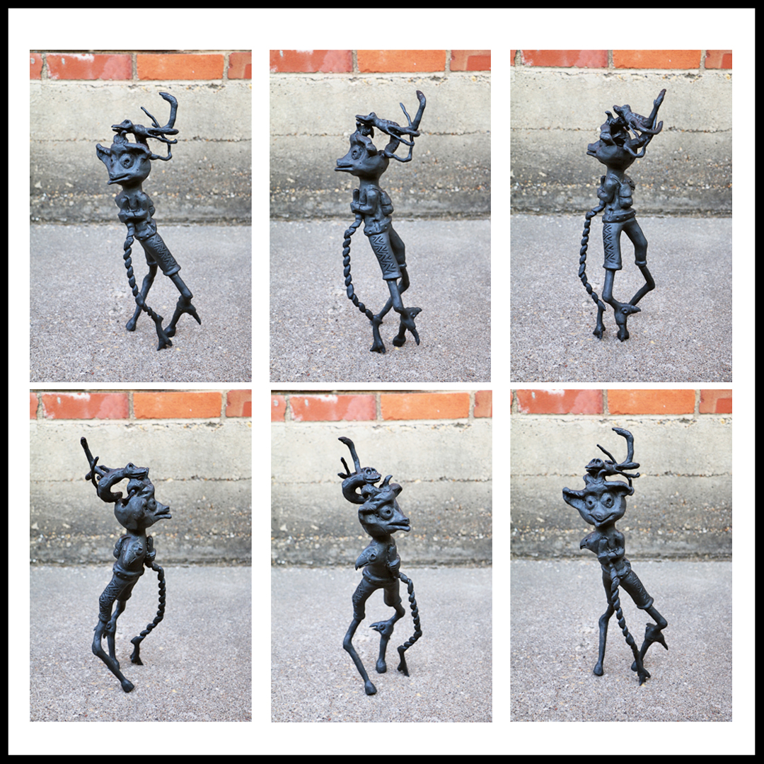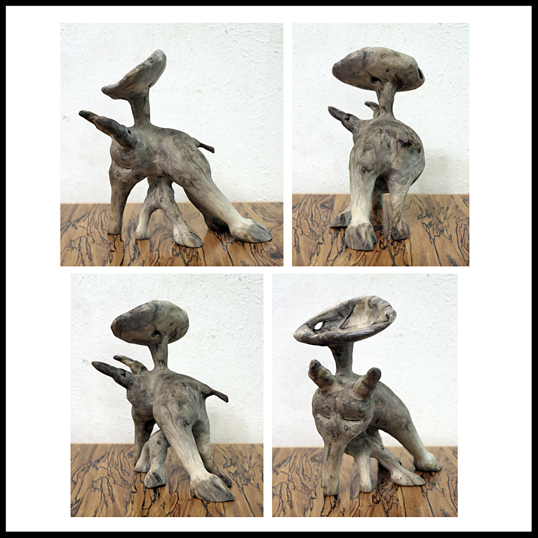 Above: Contorted ungulate sculpture resembling a goat perhaps, but with a distorted muzzle and bent legs, lifts and carries a twisted object above its back.
