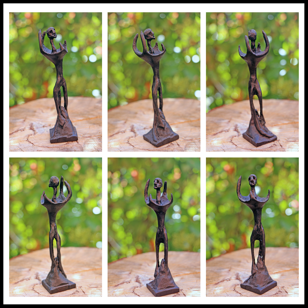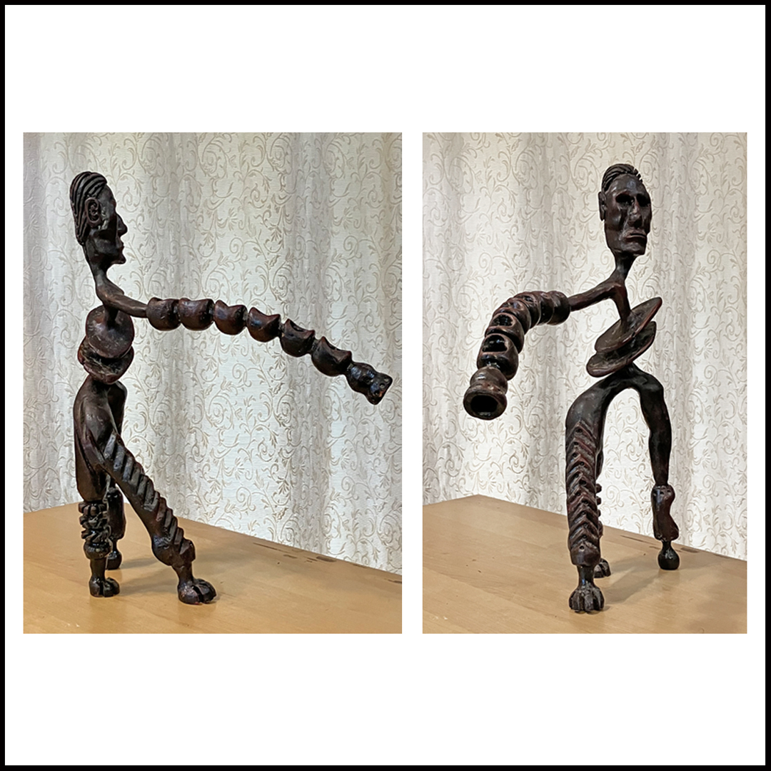 Above: Somewhat unsettling, the distorted limbs, ringed torso, extended cup-like appendage, and grim countenance of this darkly stained figure suggest severity and menace.