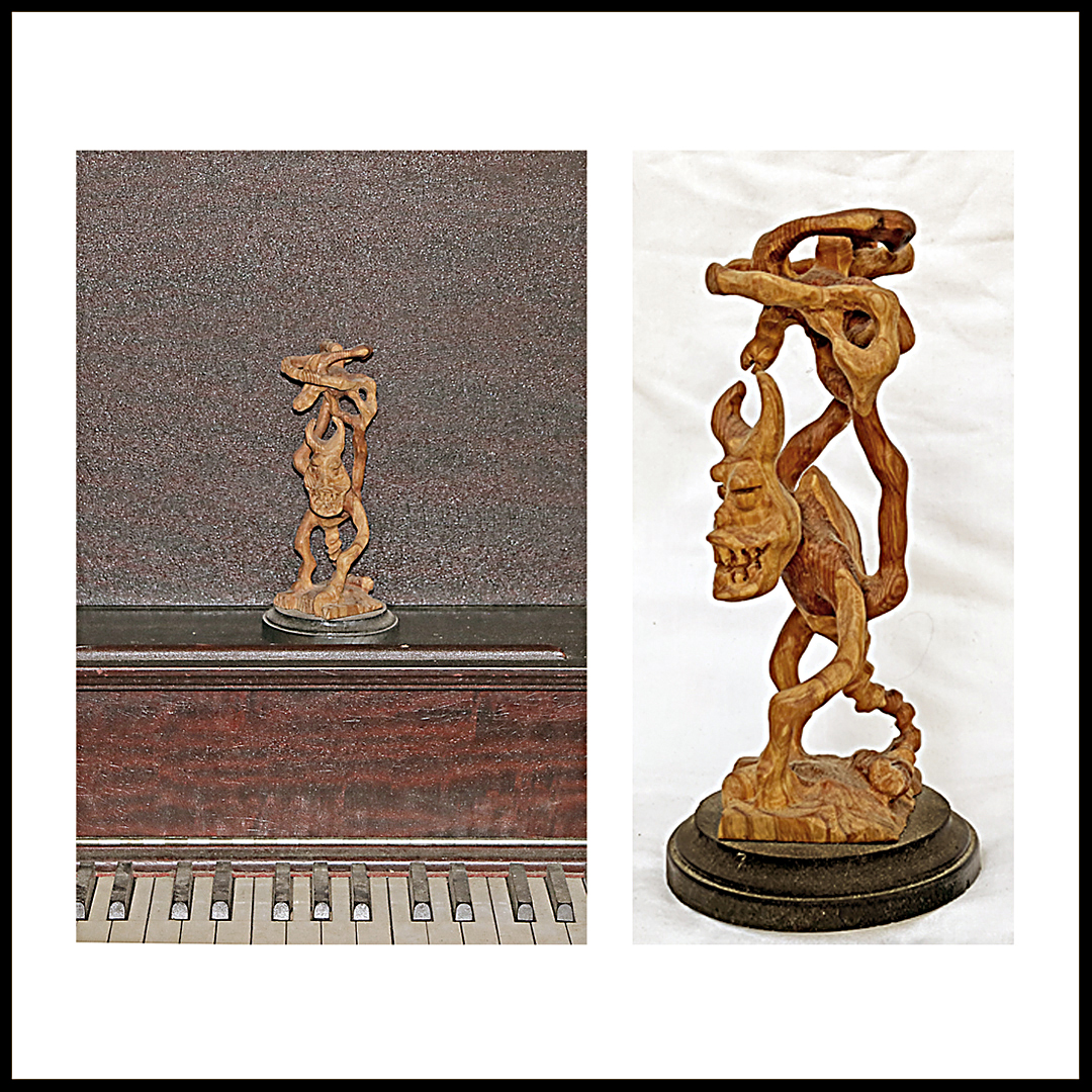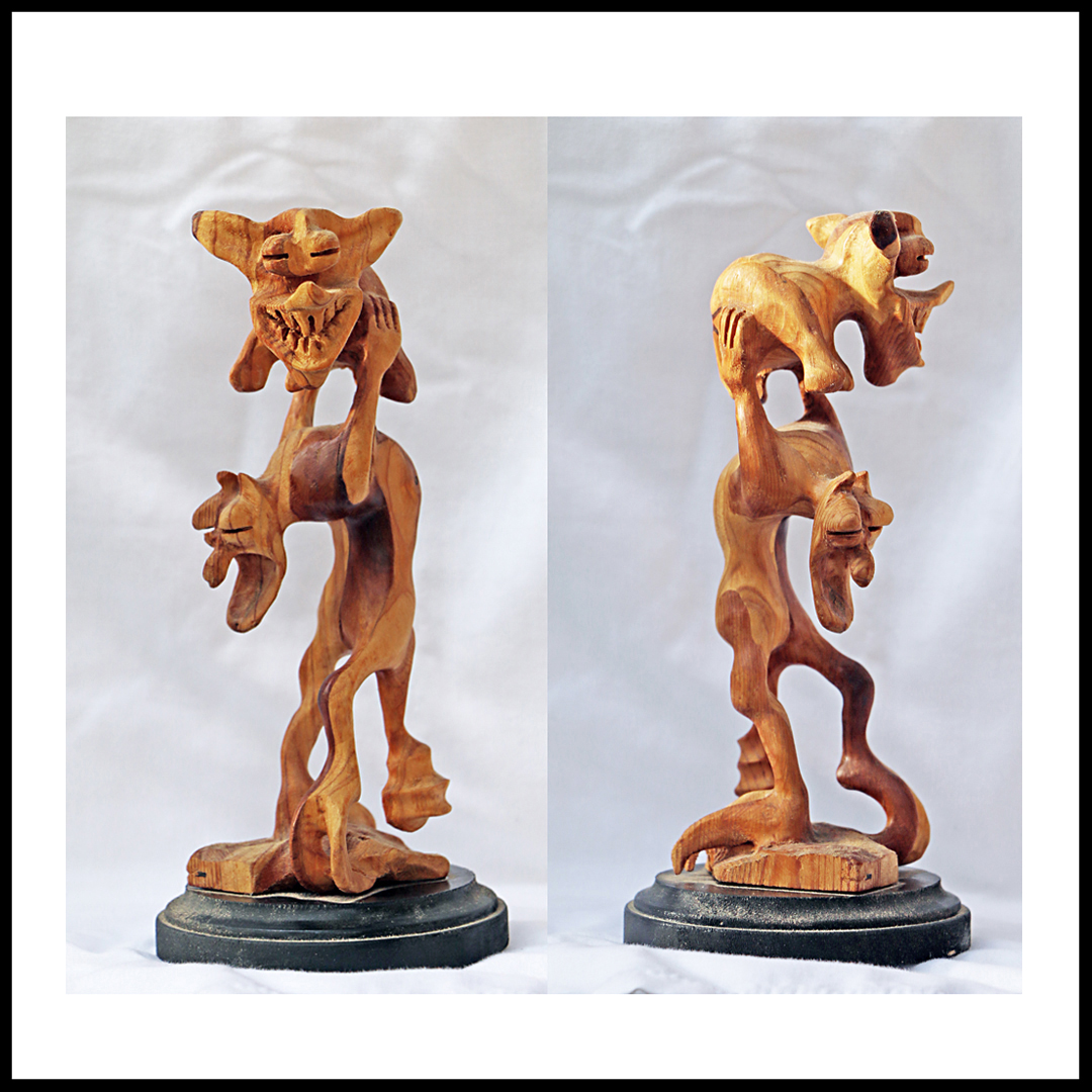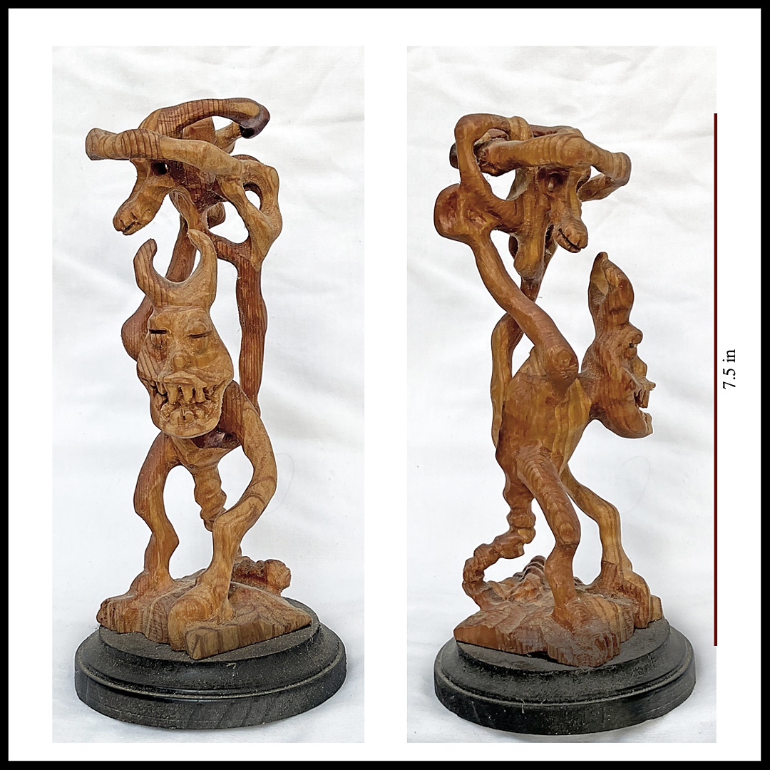 Above: Wood sculpture featuring a burdened and exasperated creature hoisting a grinning, big-eared, and toothy trickster companion above its shoulders. The piece blends fantasy and caricature.