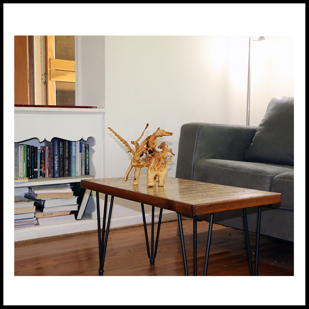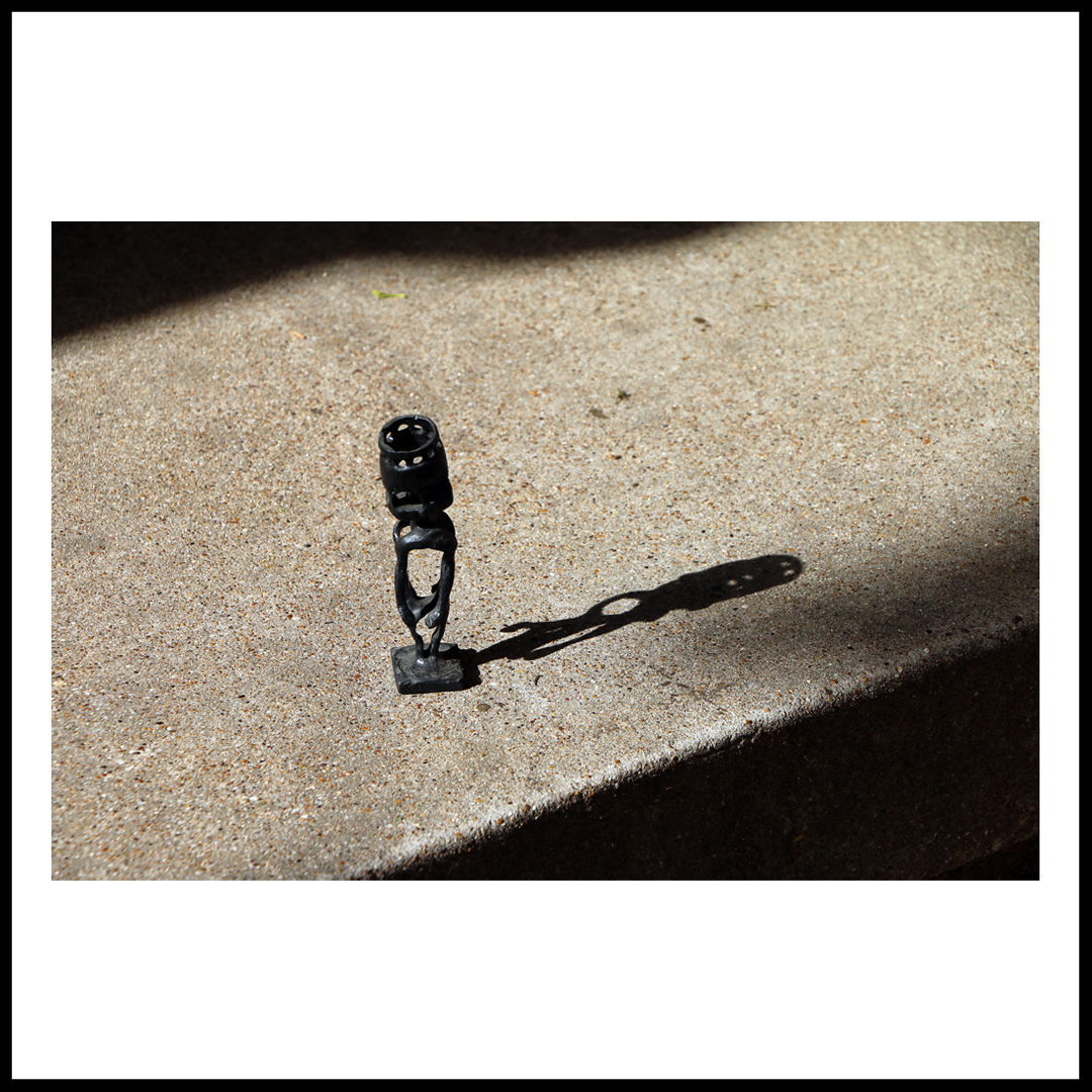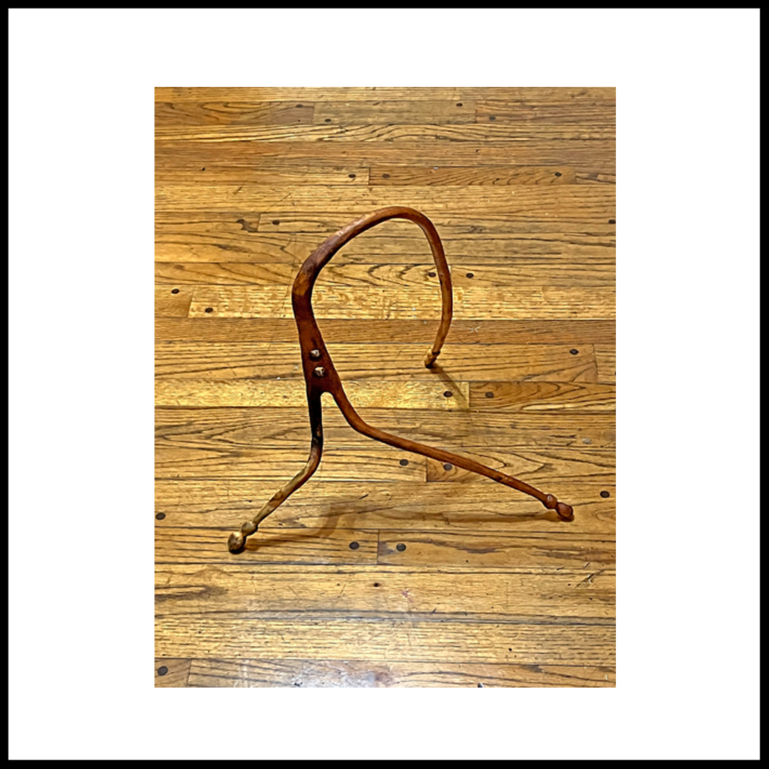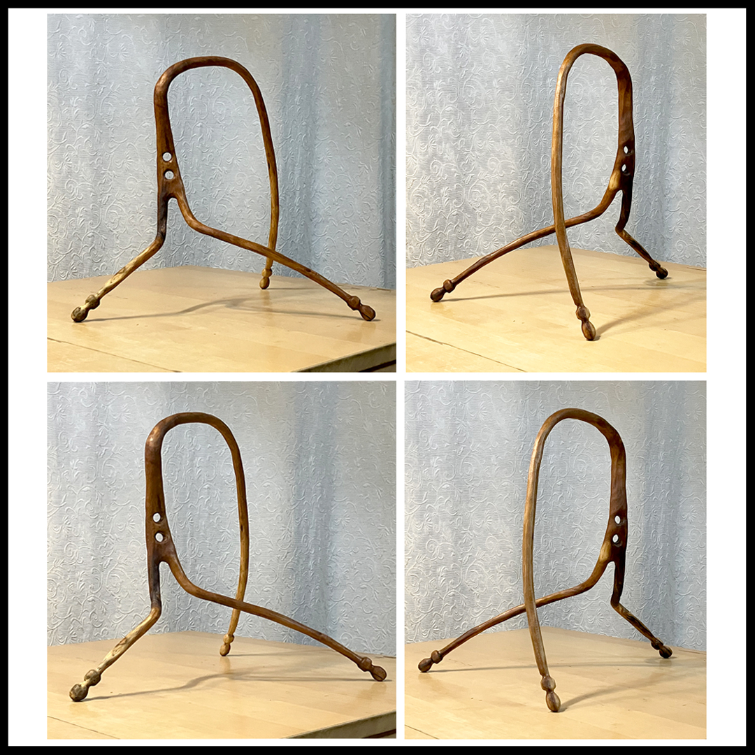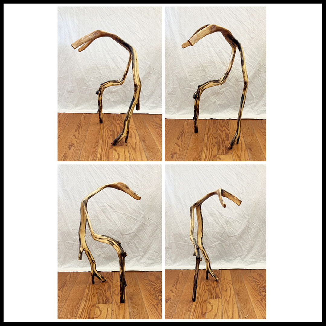 Above: Minimalistic wood sculpture composed of three slender, curved limbs that emerge from a central axis, forming an irregular arch. A bit eerie, the ‘creature’ resists fixed orientation and one almost expects it to start walking.