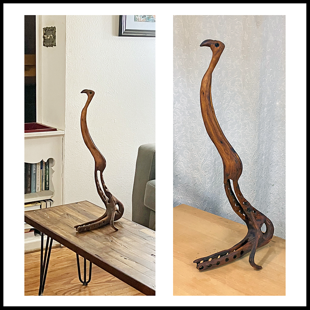 Above: Hand-carved wood sculpture of a radically elongated bird form with gnarled tripod-style legs and neck that projects outward, giving an impossibly forward lean and inquisitive aspect to the figure.