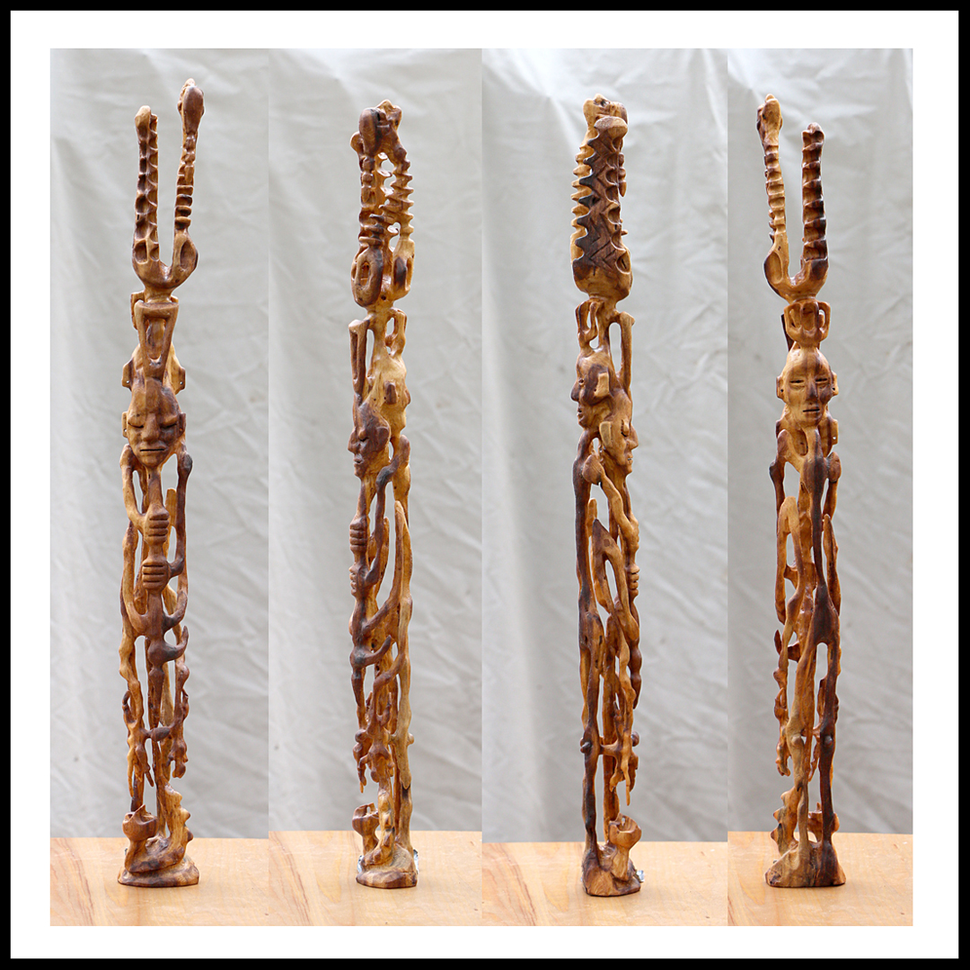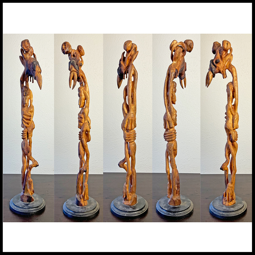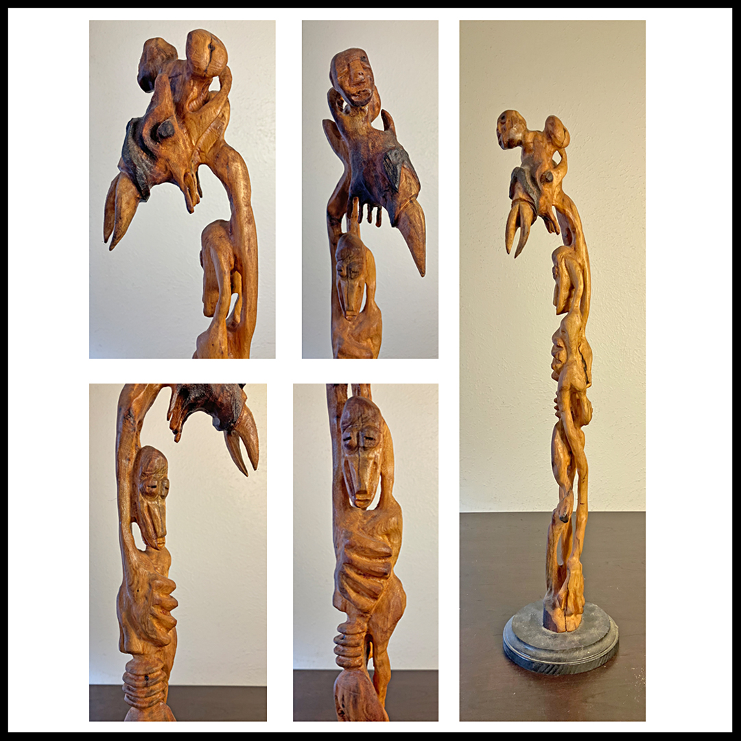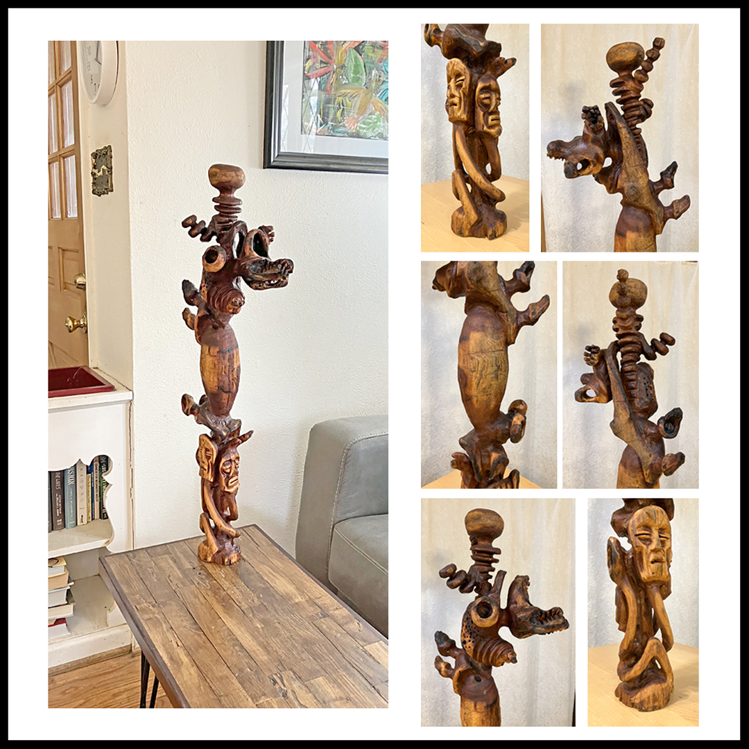 Above: A sculptural totem of fantastical design, this piece blends creature-like grotesques, intertwined and stylized human expressions, and a spiral top with knob-like crown. The middle of the carving is a smooth oval, bomb, or alien egg.