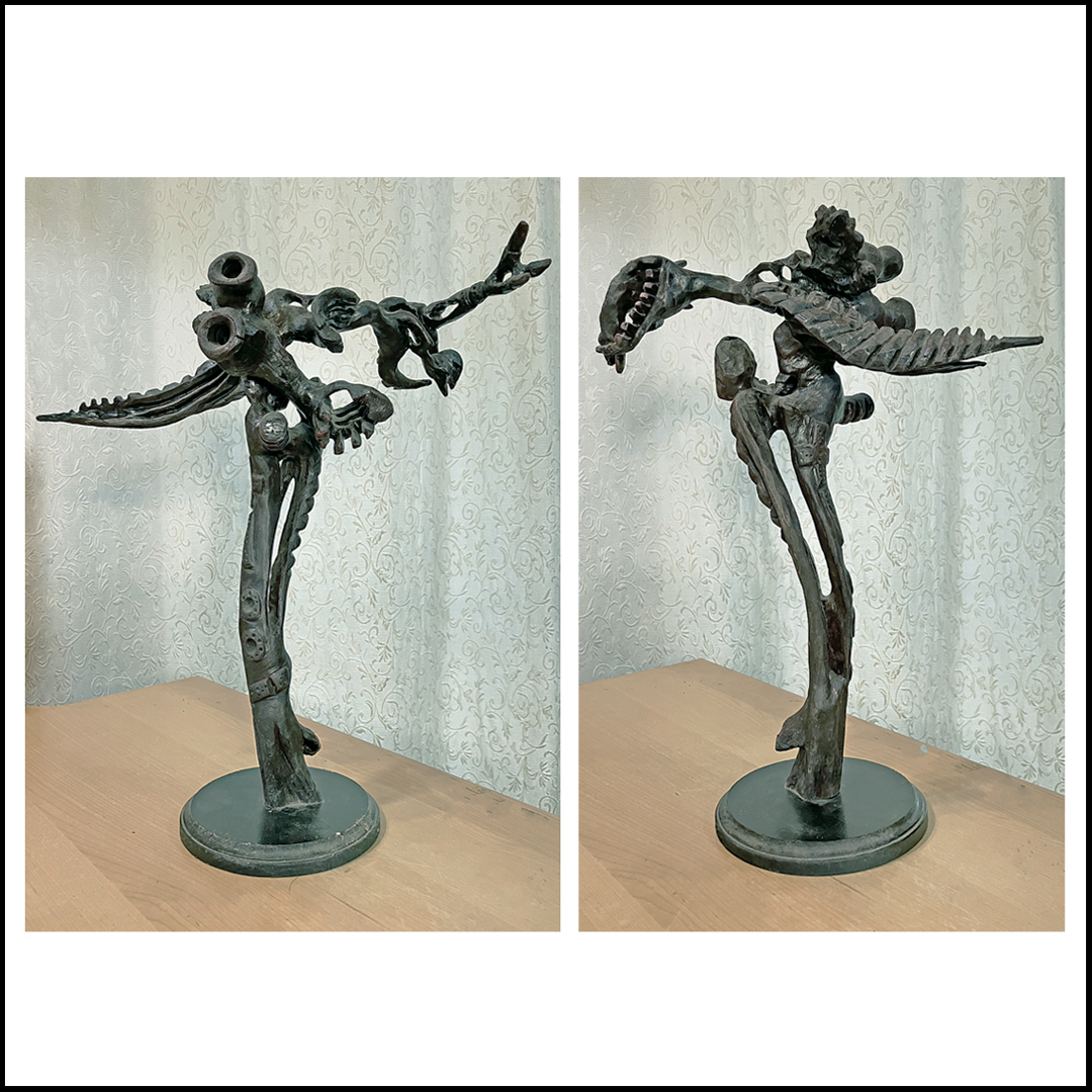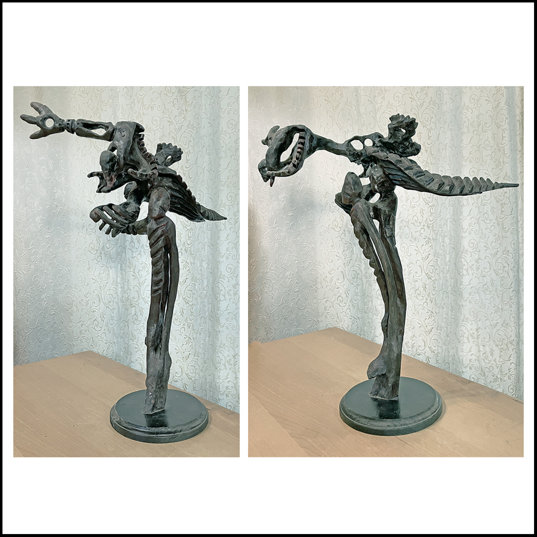 Above: Dark-stained surreal sculpture featuring two upright figures—angels, or sentinels perhaps—rising side by side, culminating in a bizarre, horizontally extended, winged creature with open jaws and distorted anatomy.
