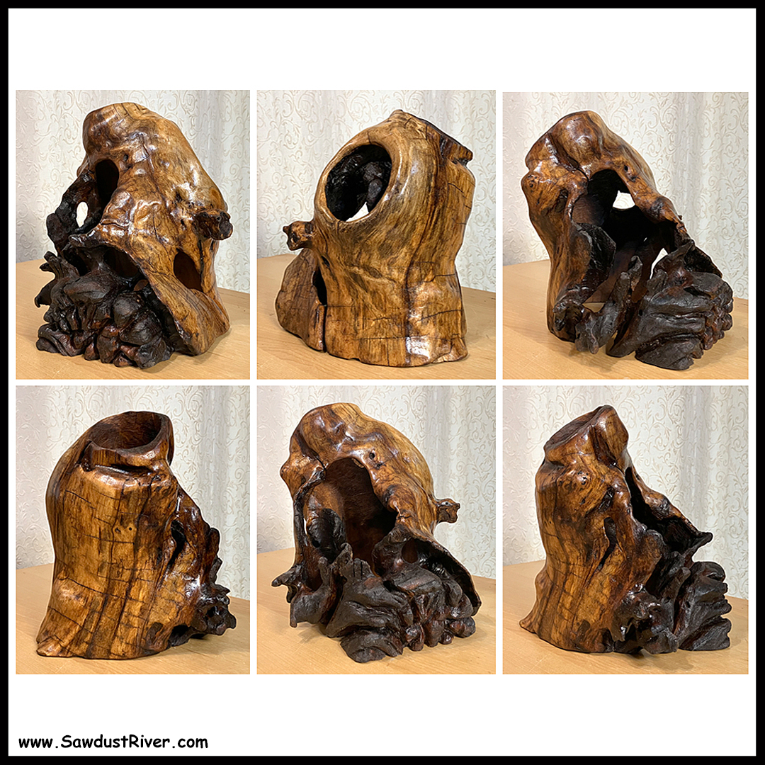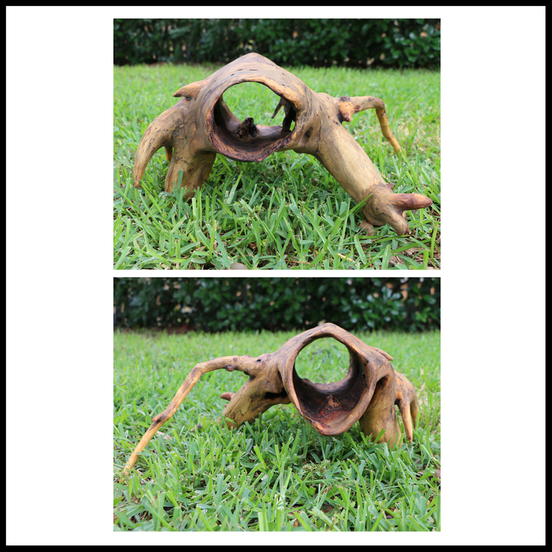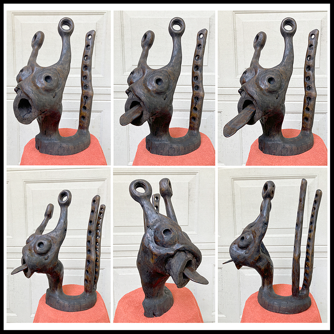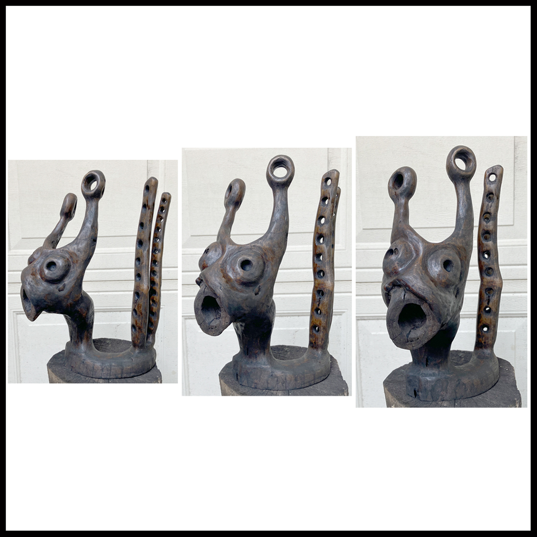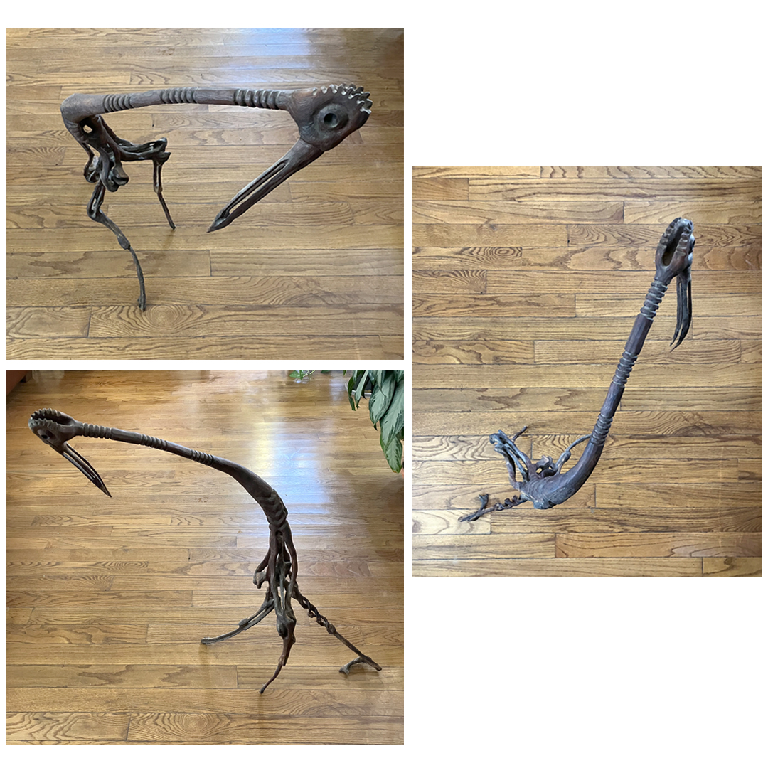 Above: This complex wooden sculpture combines bird- and dragon-like skull forms, each with hollow eye sockets and pronounced beaks that function as talon-like supports. Grooved, coiled elements extend outward from the body, amplifying its creature-like presence. Eye-catching.