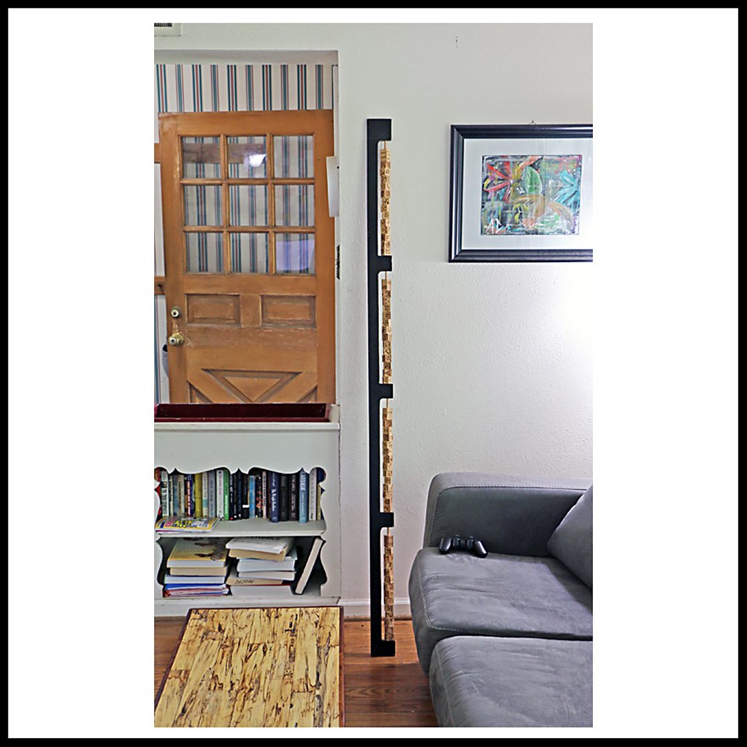 Above: Small vertical wood sculpture, a pattern experiment in cedar, alternating notches rising in wave-like rhythm.