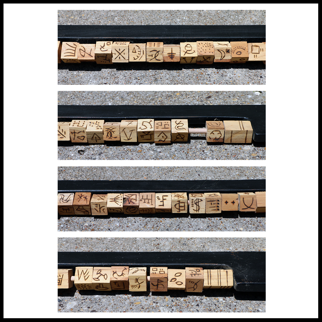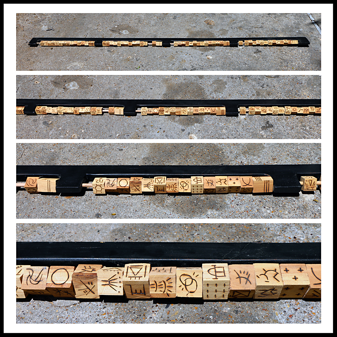 Above: An inscribed wooden fortune teller. There are four sections, or suits, each composed of 13 small blocks and one large block. All blocks are marked on four sides with geometric, pictographic, or abstract symbols. Rotation of the entire set of 56 blocks along the length of the apparatus sets the fortune in place, which must then be read. Beware the outcome.