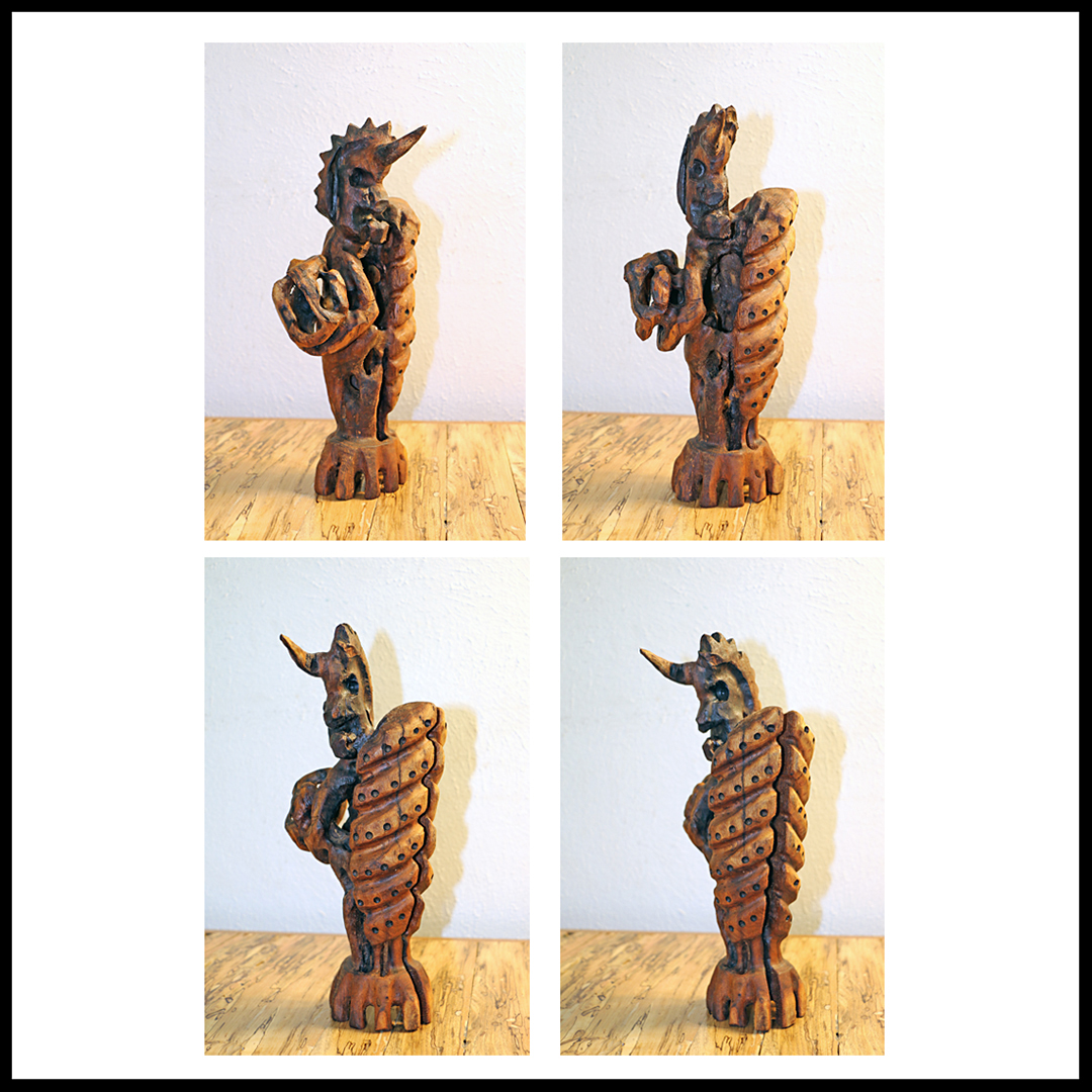 Above: Upright wooden sculpture depicts a gargoyle with spined back, narrow, single-horned head, and heavily ridged mid-section resembling a shield or armor plates. The piece conveys tension and guarded posture.