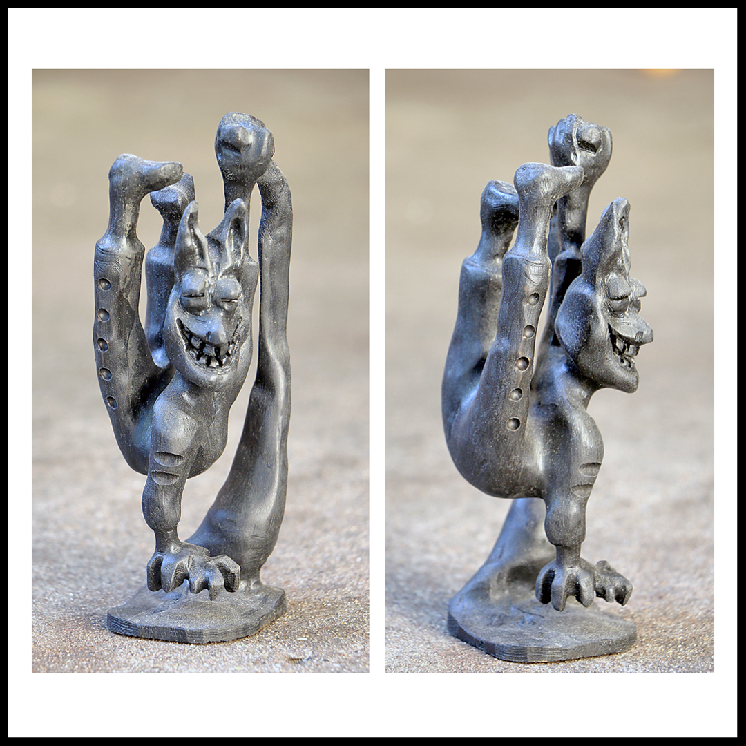 Above: This rough monkey-like figure leans forward with a crude, horned head, sunken eyes, and jutting jaw. Its off-kilter arms and legs and twisted stance add to the sense of unease, as though assembled incorrectly from parts.