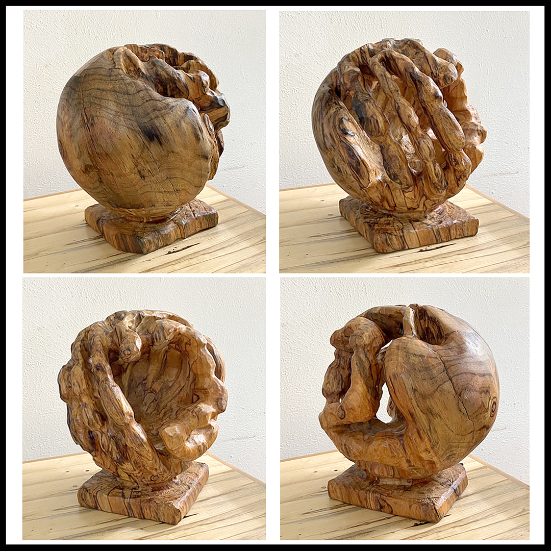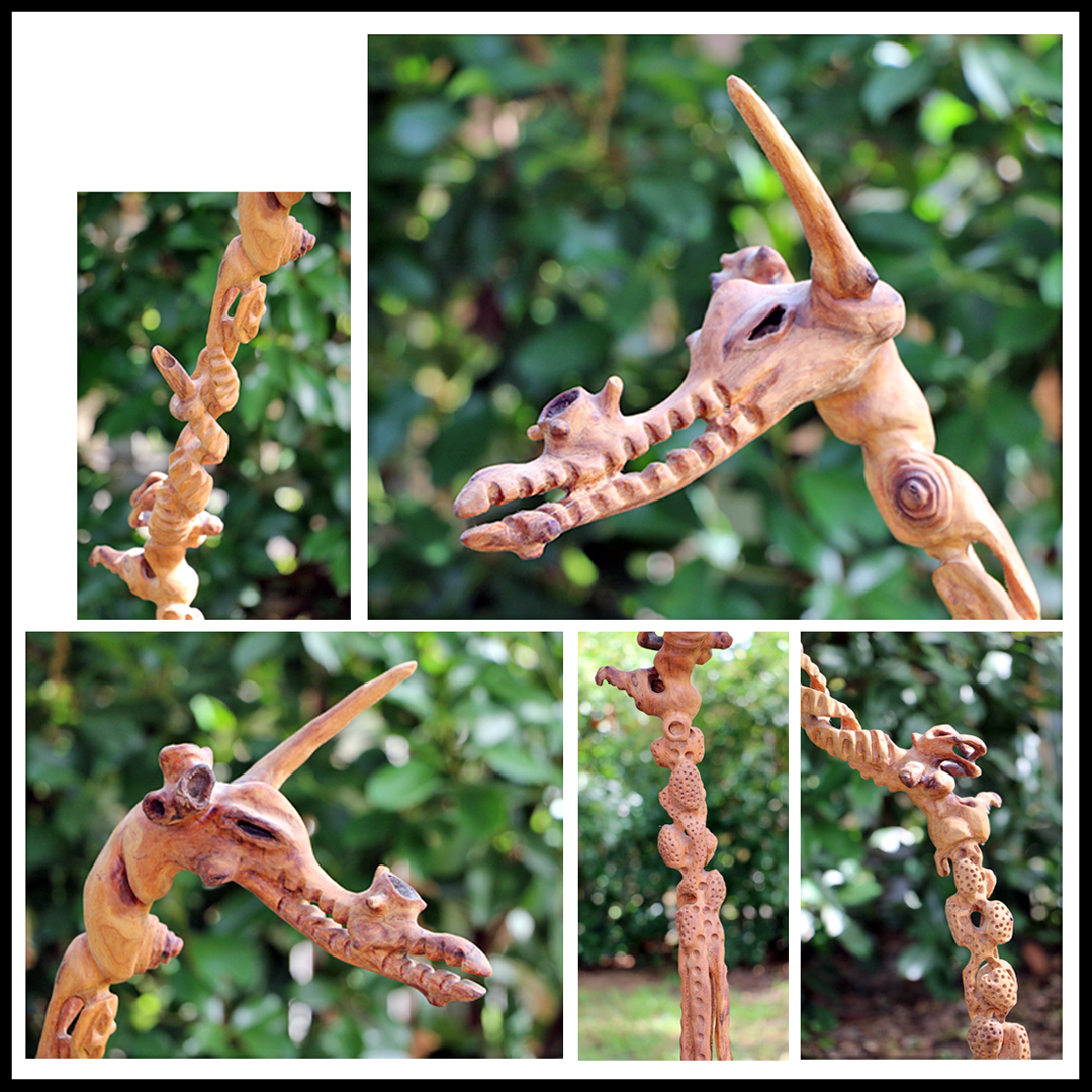 Above: A surreal wood carving featuring intertwined alien forms and a theme of dependence and protection, a guardian totem, a beaked angel perhaps…but not from this world.