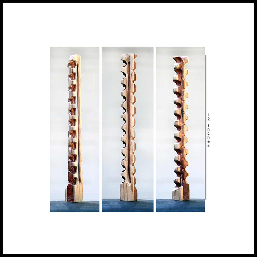 Above: Small wood sculpture carved from laminated cedar, depicting a vertical stalk with rounded pods—on the verge of opening or release.