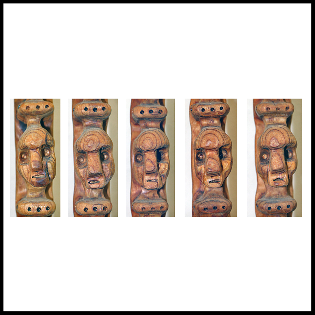 Above: A wooden totem consisting of five stacked heads projecting from an open spaced support. The faces show minimal variation, paused mid-thought with hollow eyes, watching.