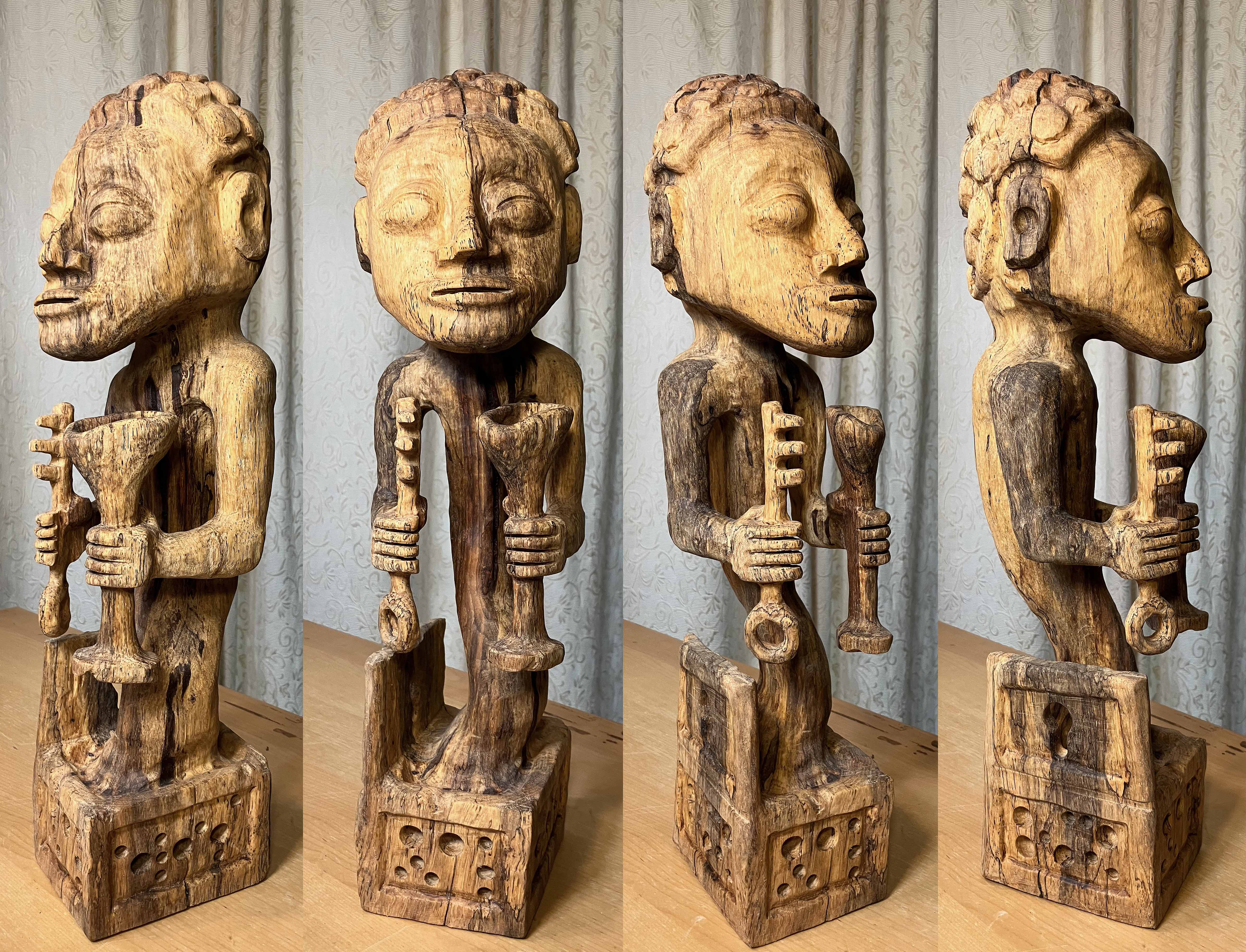 Above: This wood-carved figure rises from its enclosure holding symbolic chalice and key. With strong, primitive features, minimal expression, and weathered surface, the figure stands waiting.