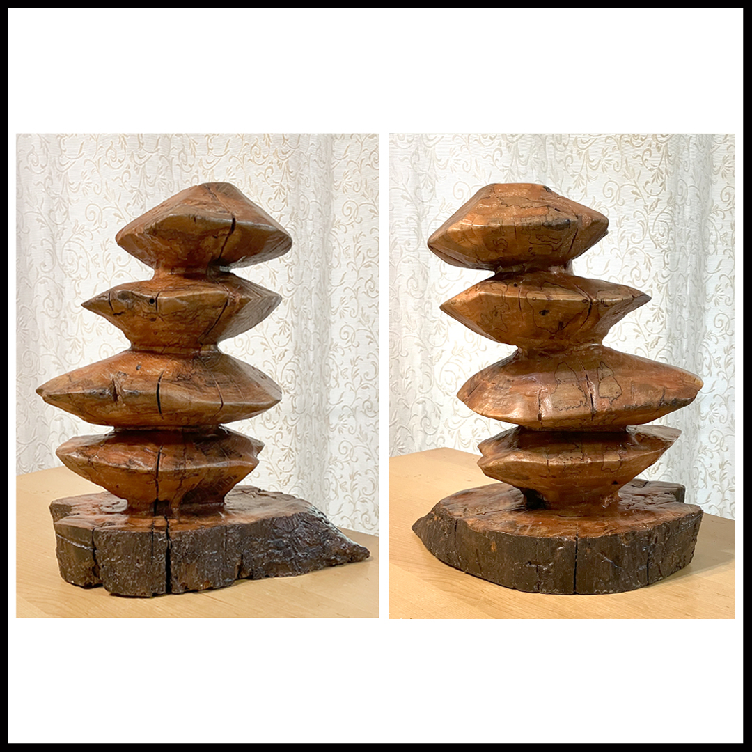 Above: Small wood cedar sculpture consisting of a vertical stack of cored bulbs or cups, each facing a different direction.